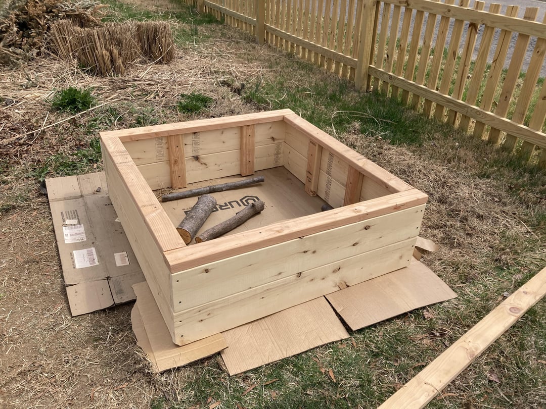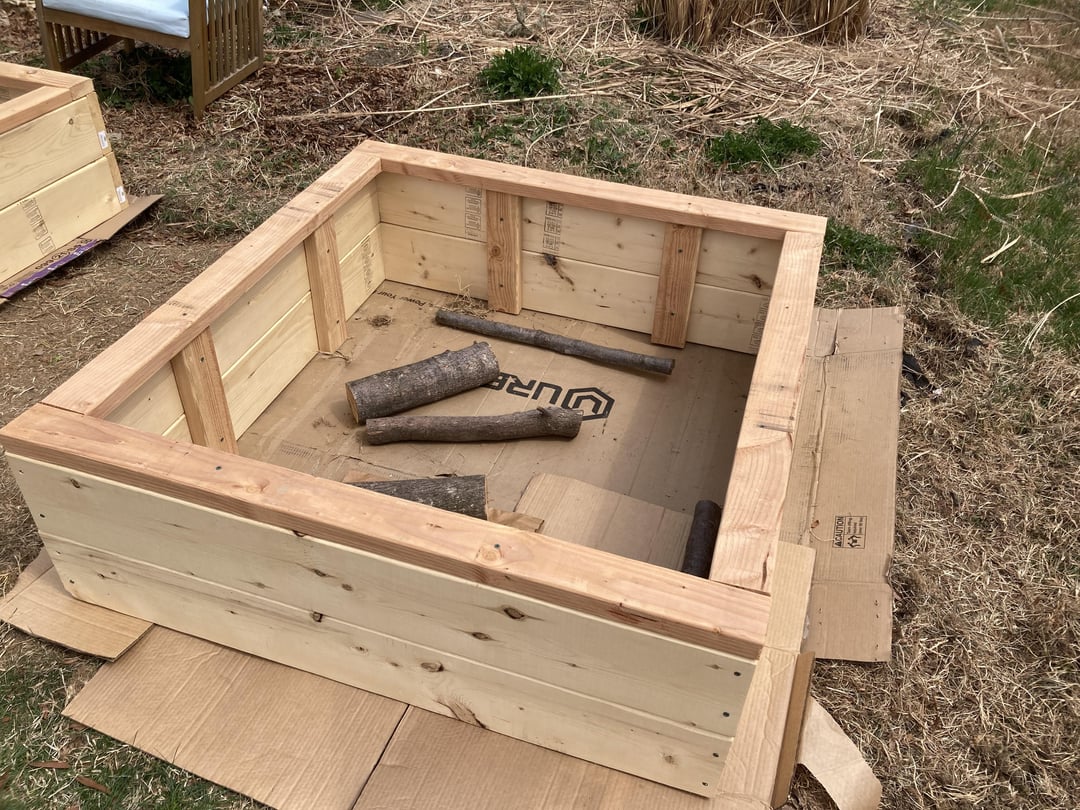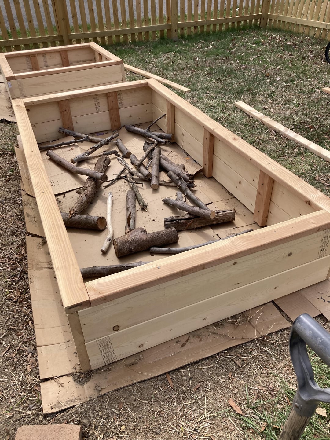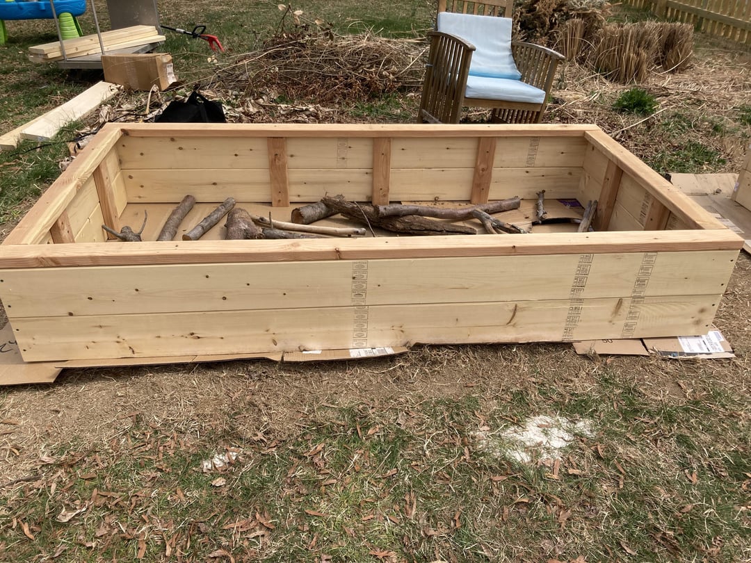 上げられたベッドの缶を構築したばかりで、丸太と庭の破片で底を満たしました