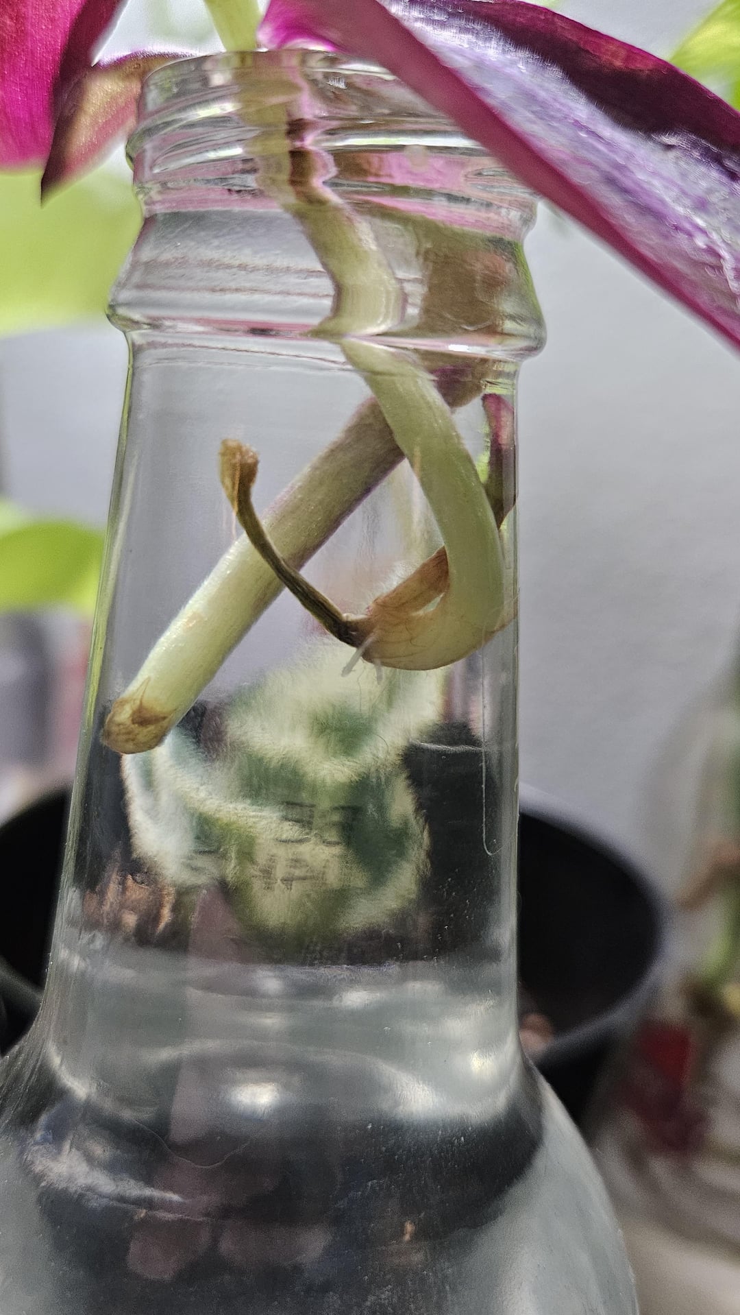 約5日前にHome Depotで壊れたこれらの2つの悲しい外観が見つかりました。あまり進歩していなかったので、水をポトスのプロップ水に置き換えることにしました。今、私はいくつかの根を見始めています! 私に新しい植物なので、うまくいけば、私はすぐに素敵な鉢植えの母植物を手に入れることができます。