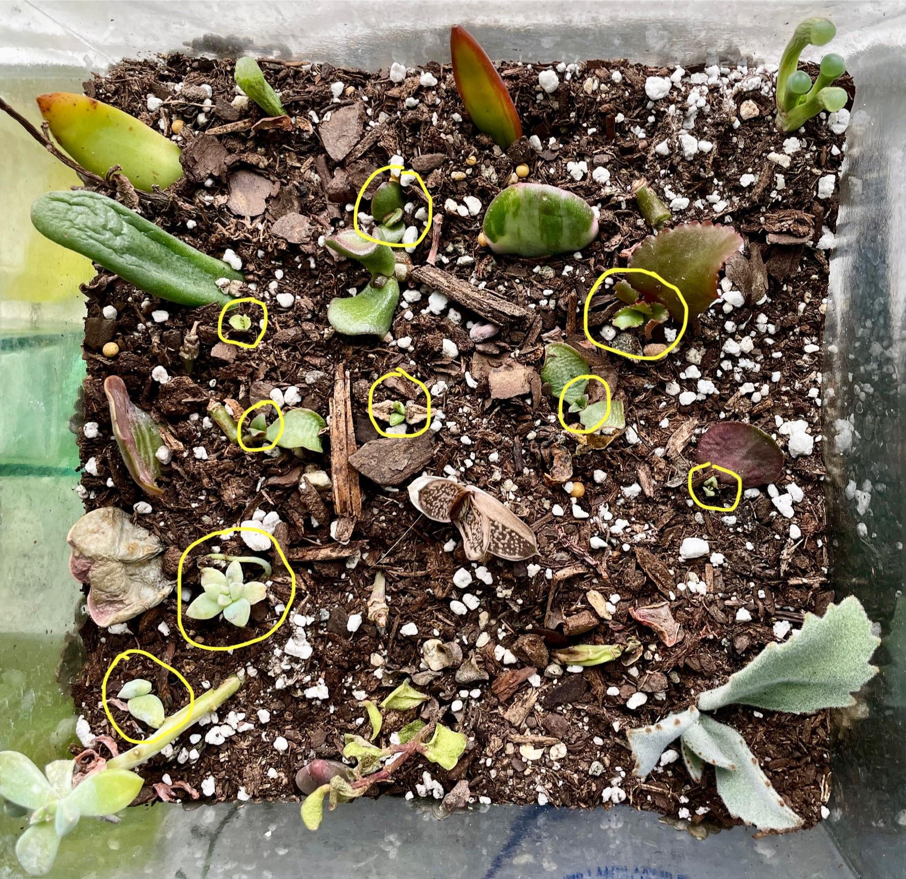 数ヶ月前にランダムな多肉植物小道具のこの瓶を始め、ついにそれらの多くに新鮮な緑の芽を手に入れました!