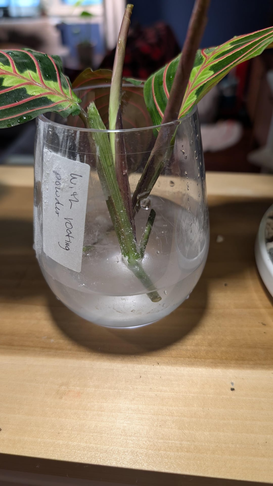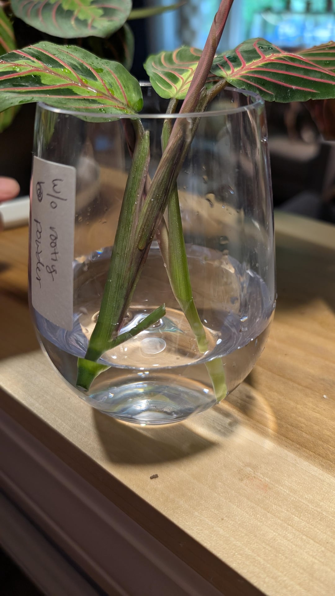 1日目:祈りの植物を伝播する半科学実験。ルートパウダーとルートパウダーなし。同じ植物からの挿し木は、使用に最も似た挿し木を選んだ。同じタイプの容器、同じ照明、同じタイプと量の水。パウダーがより速くルート化するのに役立つかどうかを確認します!また、いくつかの追加の小道具を備えた土壌を根付かせることでこれを試してみます。