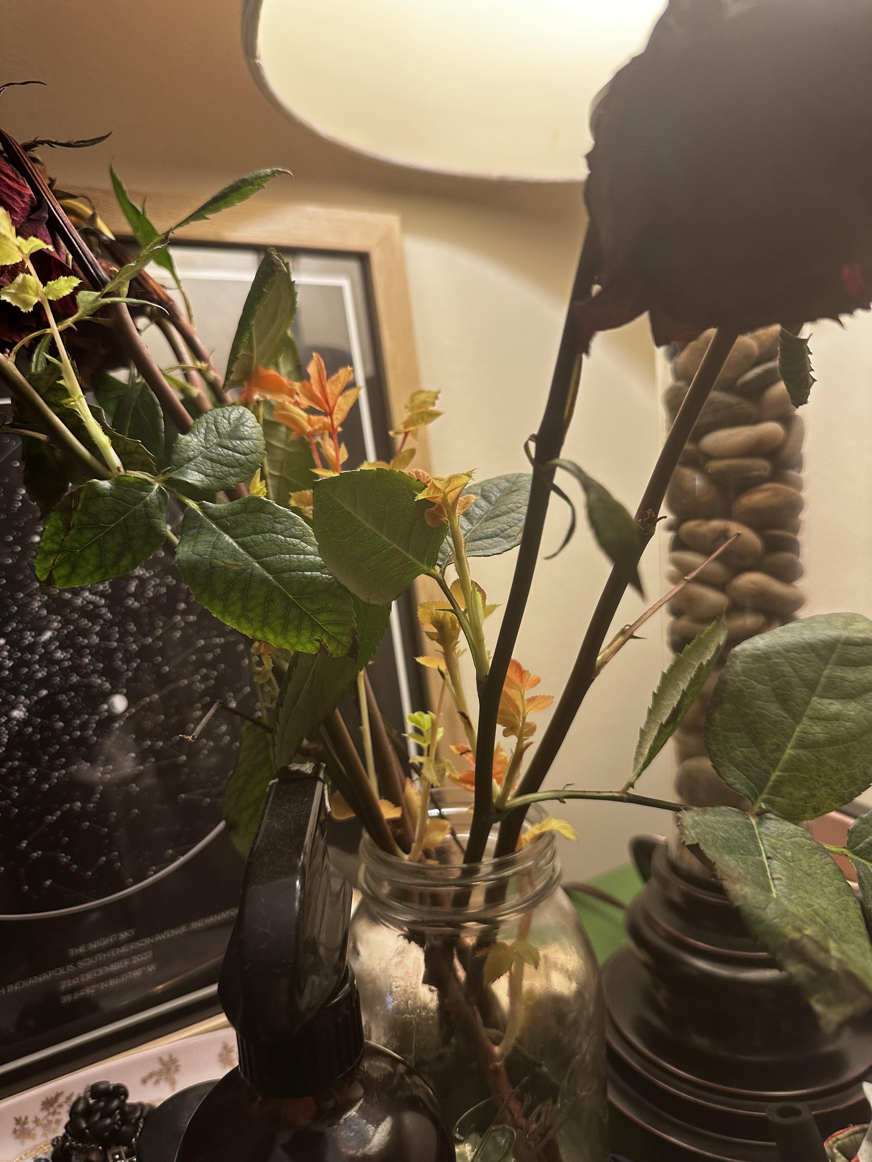 数週間前(たぶん3?)私の夫は私に6本のバラを家に連れてきました。私は植物の食べ物を石工の瓶に水と一緒に投げ、ドレッサーに座って、私の日々を過ごしました。今日、私は「ああ、そう、それらの花は死んでいる。おそらくそれらを捨てるべきだ」と気づいた。私が光をオンにしたとき、私はこのすべてに気づきました…。成長??? (私を許してください、私は私の人生でこれを見たことがありません😅😅)これは植えることができますか?これらはただ…もっと…バラですか?私がこれまでにバラを買った店について私が知っていた唯一のことは、彼らがただきれいであり、私は彼らが死ぬまで彼らを一杯の水に入れているということです。これはすべて私にとってとても異質です!助けてください!