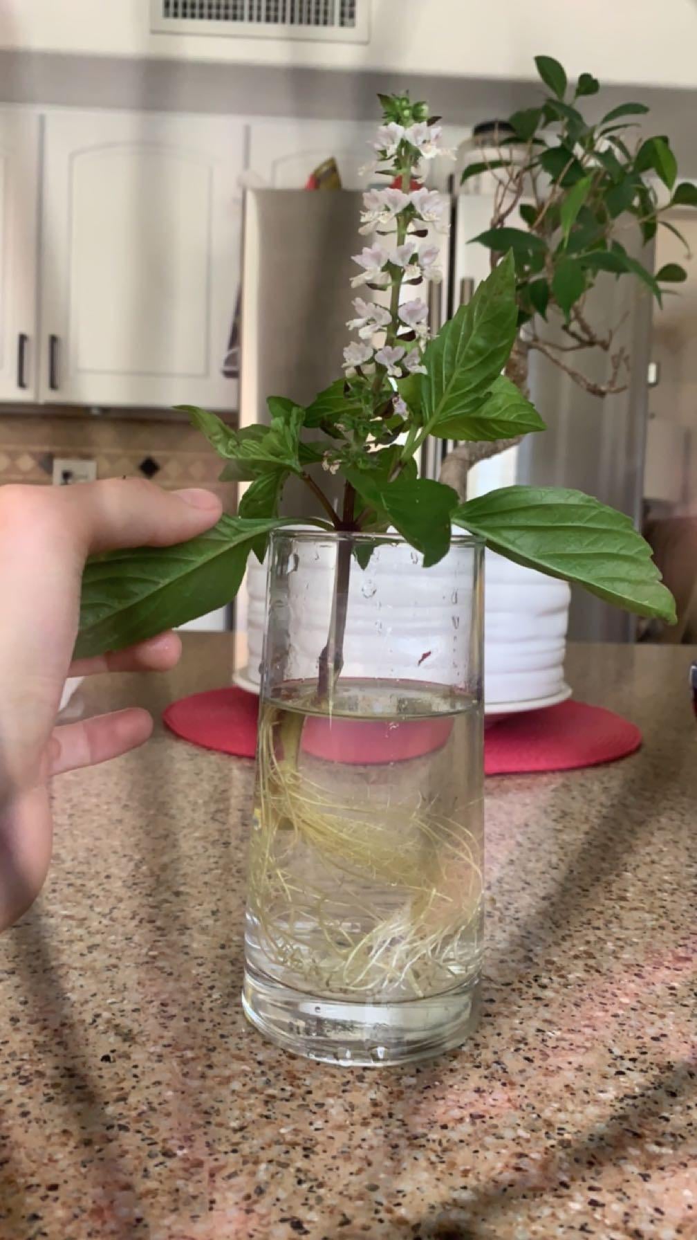 フォーの店で採れたバジルの小枝が雑草のように成長し、花まで咲きました。