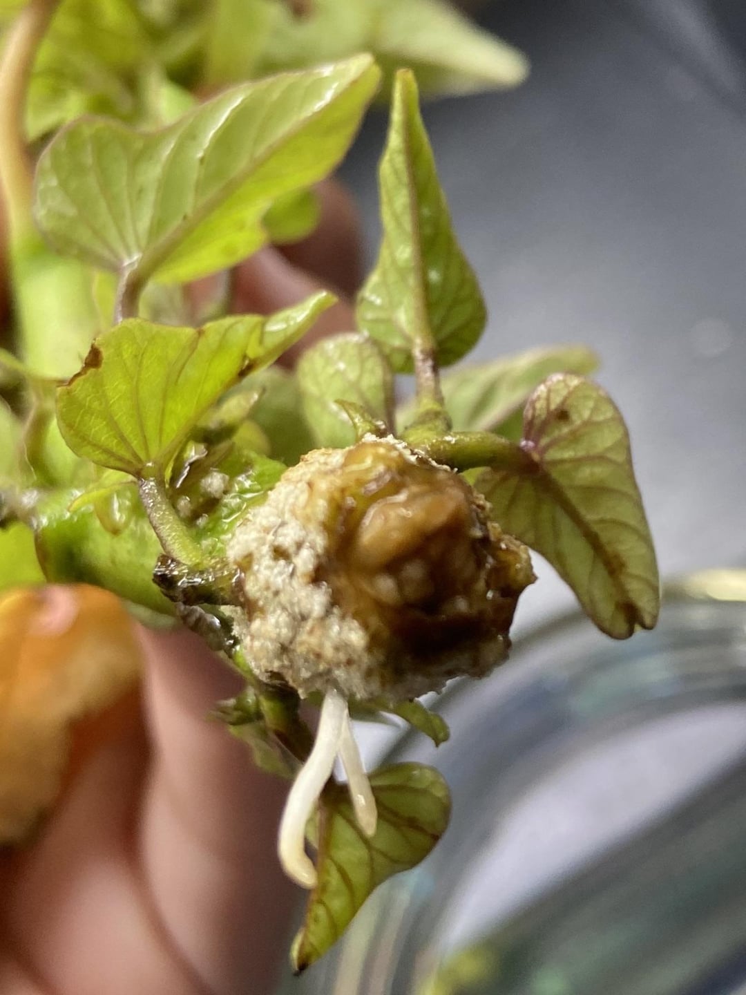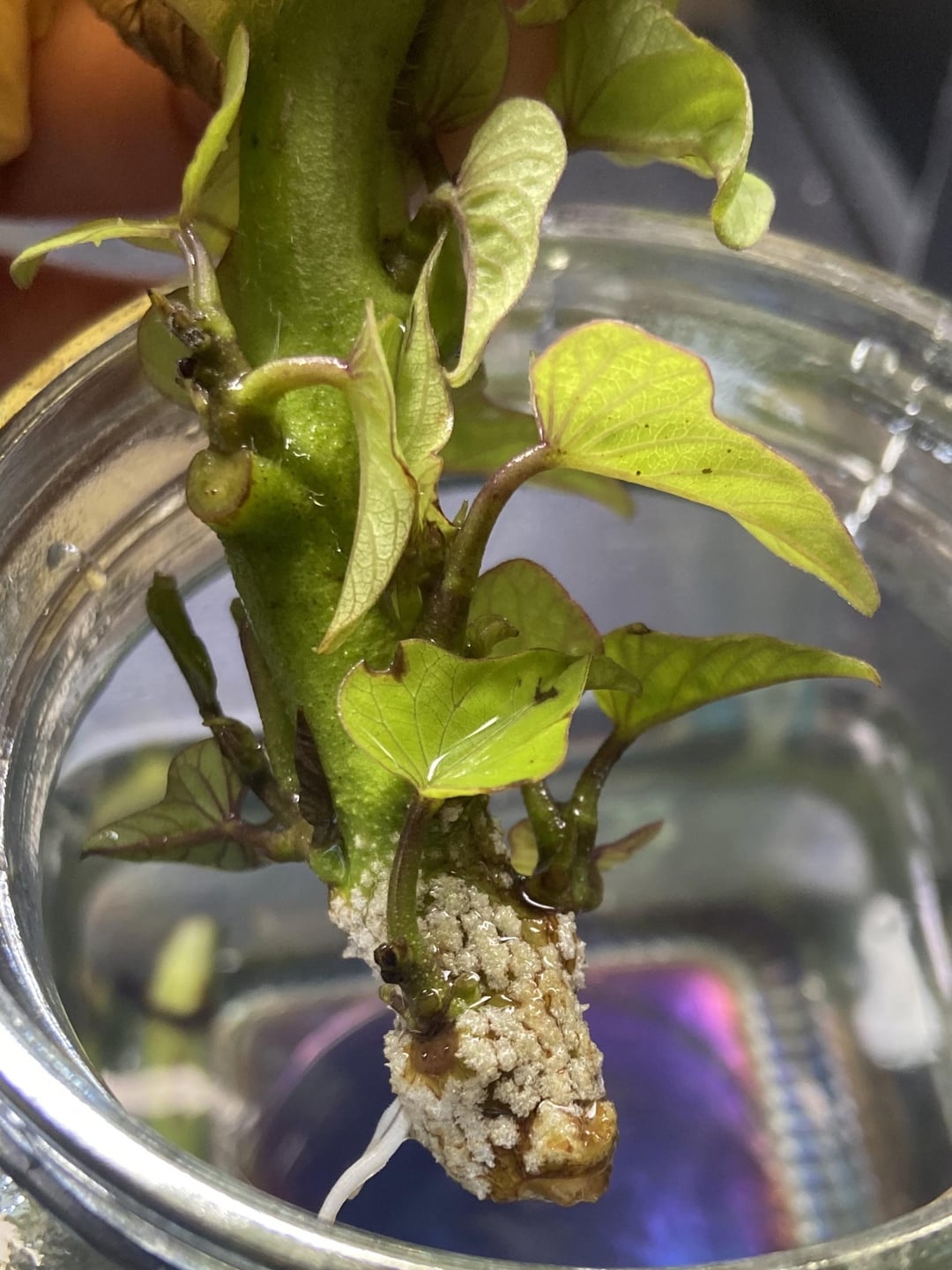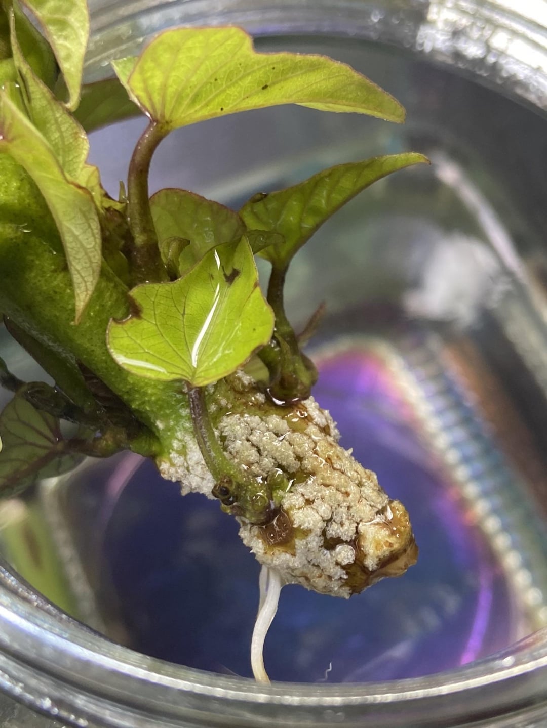 数週間前、ロウズ店の床でサツマイモのつるの挿し木を見つけた。 一度水にさらして肥料を与えました。 でも、下の方に白いブツブツがあって怖いんですが・・・これは何でしょうか、どうすればいいでしょうか?