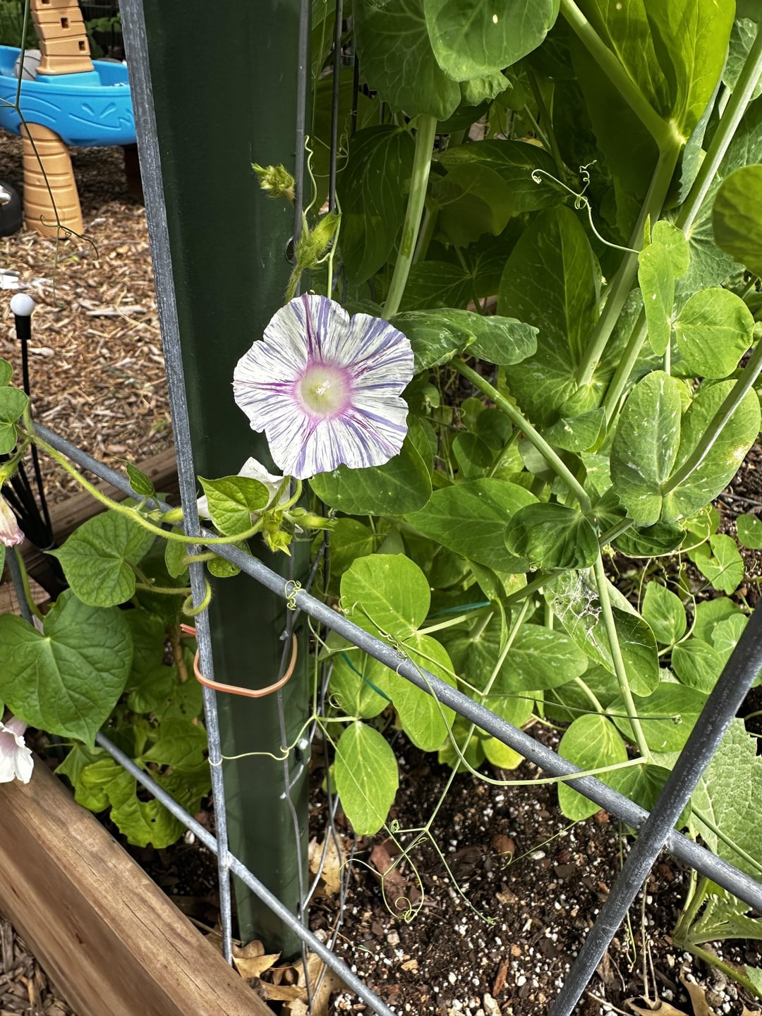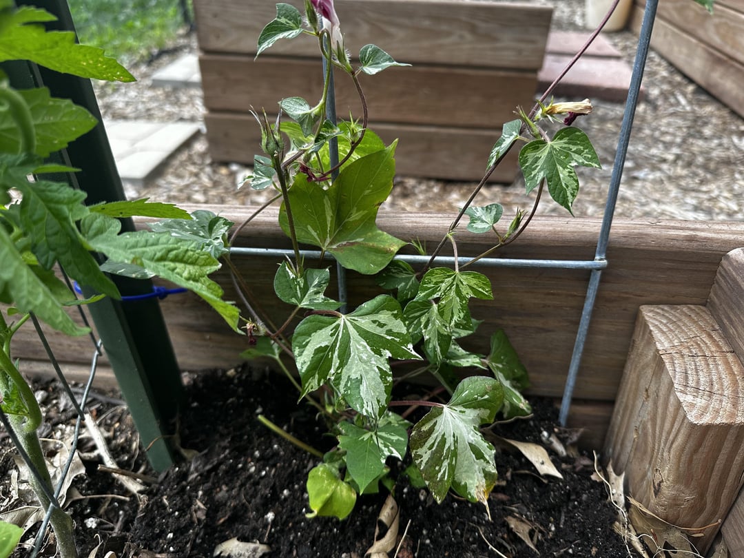 私は庭のトマトトレリスで朝の栄光を育てるのが大好きです。今年はこれらの2つの興味深い品種を見つけました!彼らが成長するのを見ることに非常に興奮しています。