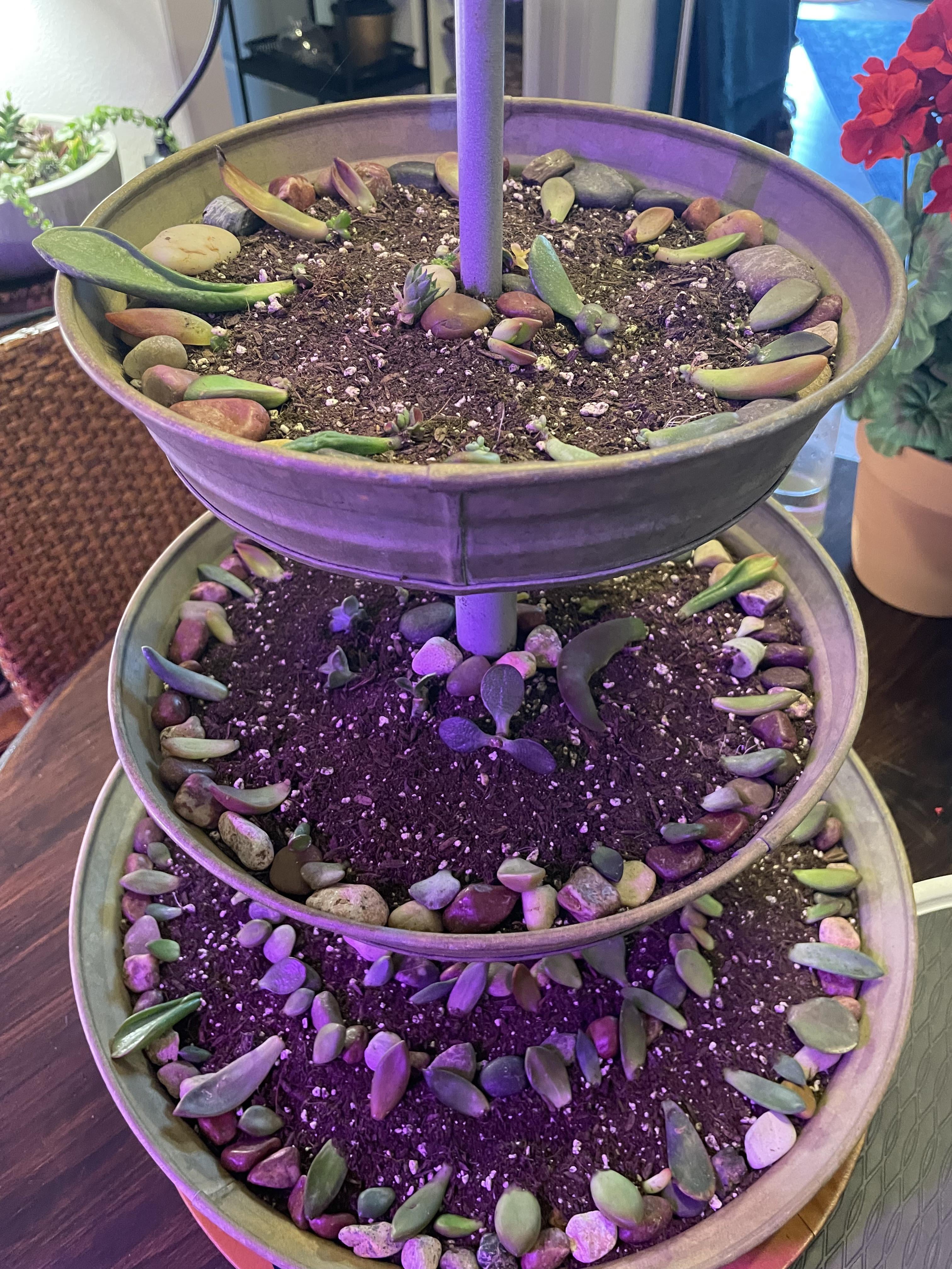 この時点で制御不能になっているプロップリフティングの問題を収容するために作ったプロップステーションを披露したかったのです。私はこのメタルの3層の回転をのれんで手に入れ、それの使用を把握しようとしており、これは完璧になりました。私は新鮮なものを下に、根の根の根が真ん中に、赤ちゃんが上に成長しているものを置きます!その後、確立されると、それらを自分の鍋に移動します。この時点で、私は最終的に何百もの多肉植物を持ち、それらがすべて実現したら、それらをどうするかわかりません。何かアイデア?私には彼らにを渡す友達がいません