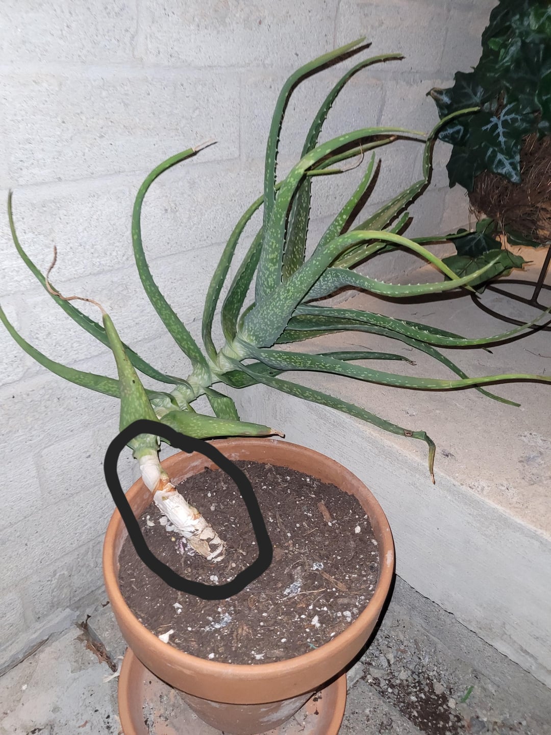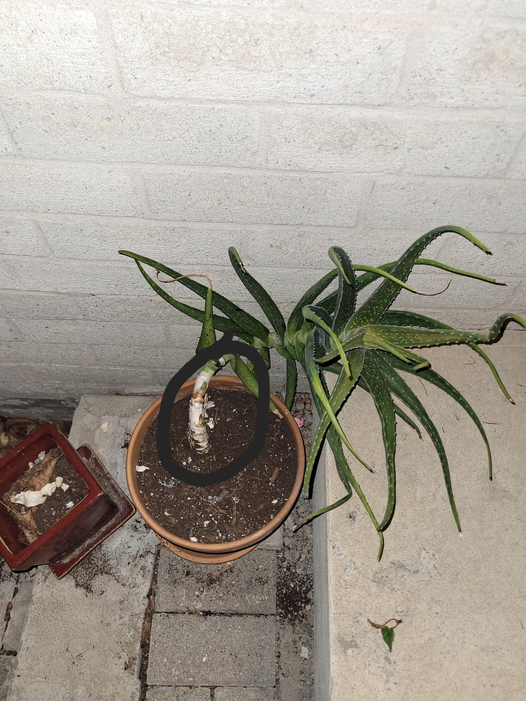 私のアロエを壊した、母親は遠くに寄りかかっていて、あまりにも多くの子犬を持っていた。母親を植え替えるのは少し面倒です。彼女を引き抜いて数日間彼女を乾燥させた後、私は同じように彼女を鉢植えにしました。写真は、私が埋めたい領域を丸で囲んだ現在のアロエの母を示しています。