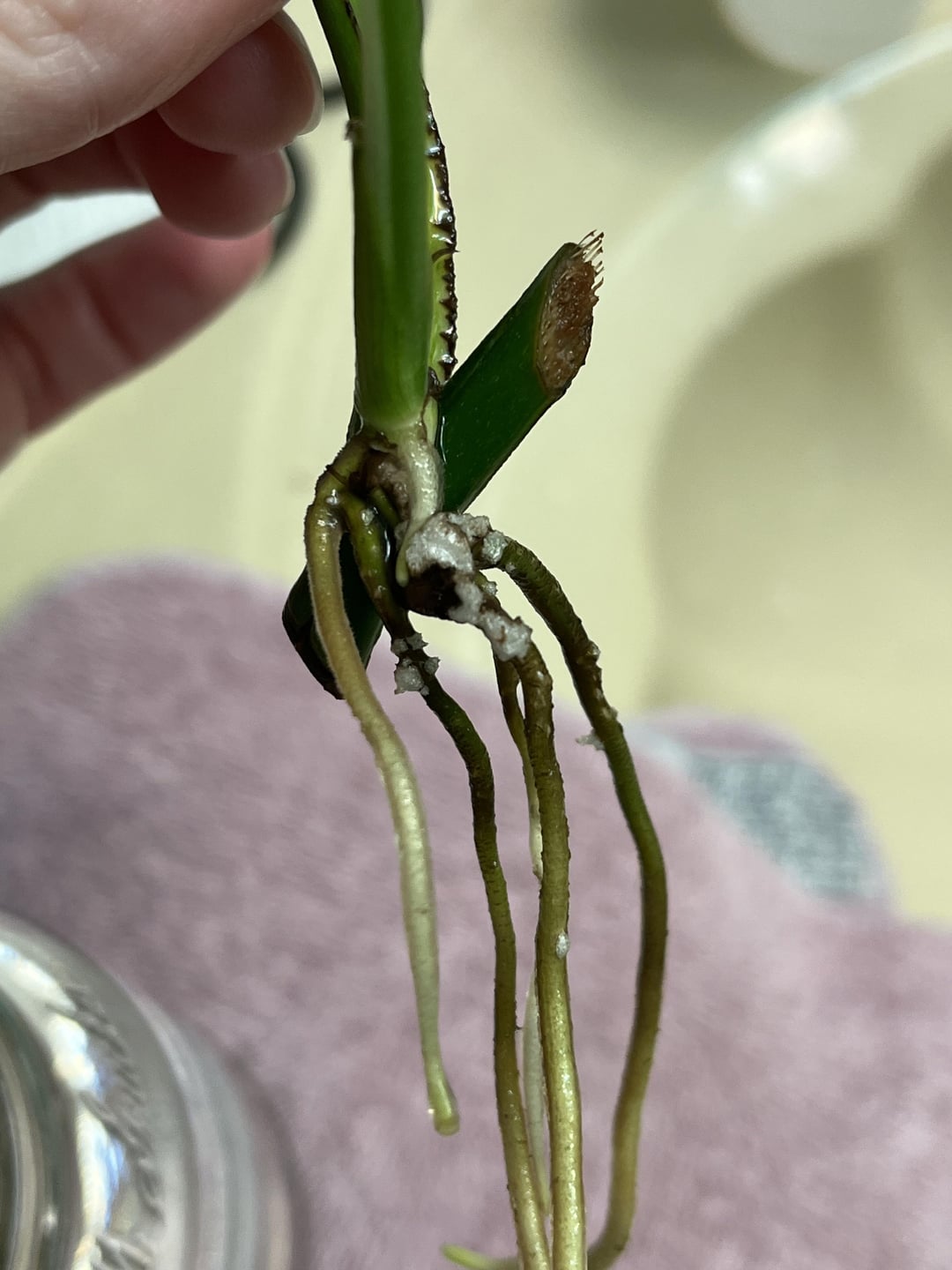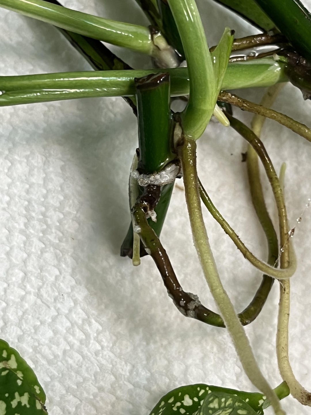 4つのポルカドットの挿し木とカップルのZZカッティングとともに、私のポトスを繁殖させています。これらはルーツに何がありますか?彼らはちょっと固いものです。これらの新しいポケットが出現するためのこれらの新しいポケットはありますか?またはカビ??