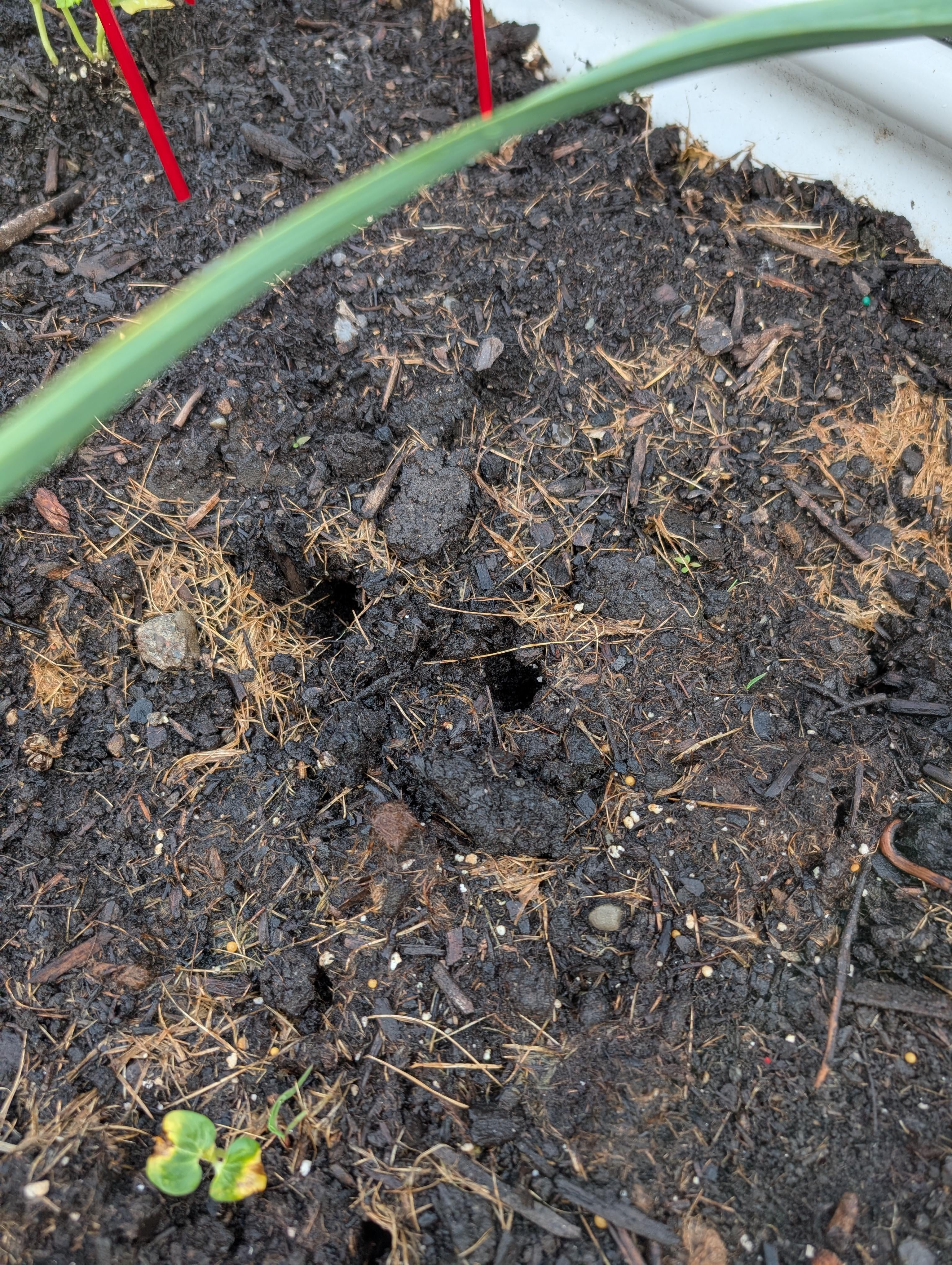 こんにちはフレンドリーなReddit Gardeners!熱狂的であるが比較的経験の浅い庭師は、この写真の中っぽい中号に害虫が2つの穴を作成したものに関するアドバイスを探しています。スケール用のバナナはありませんが、穴は直径約1 cm、深さは約2 cmで、AM WateringとPM Garden Patteringの後に現れました。私はあまり気にしませんが、右側の穴に苗がありました。私はニューヨーク州西部(ゾーン6b)にいるので、庭は始めたばかりです…私はこれを芽に挟みたいです…
