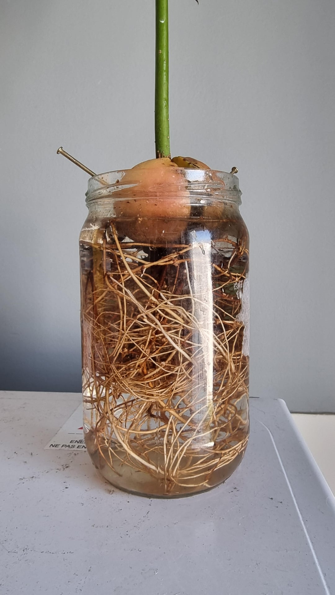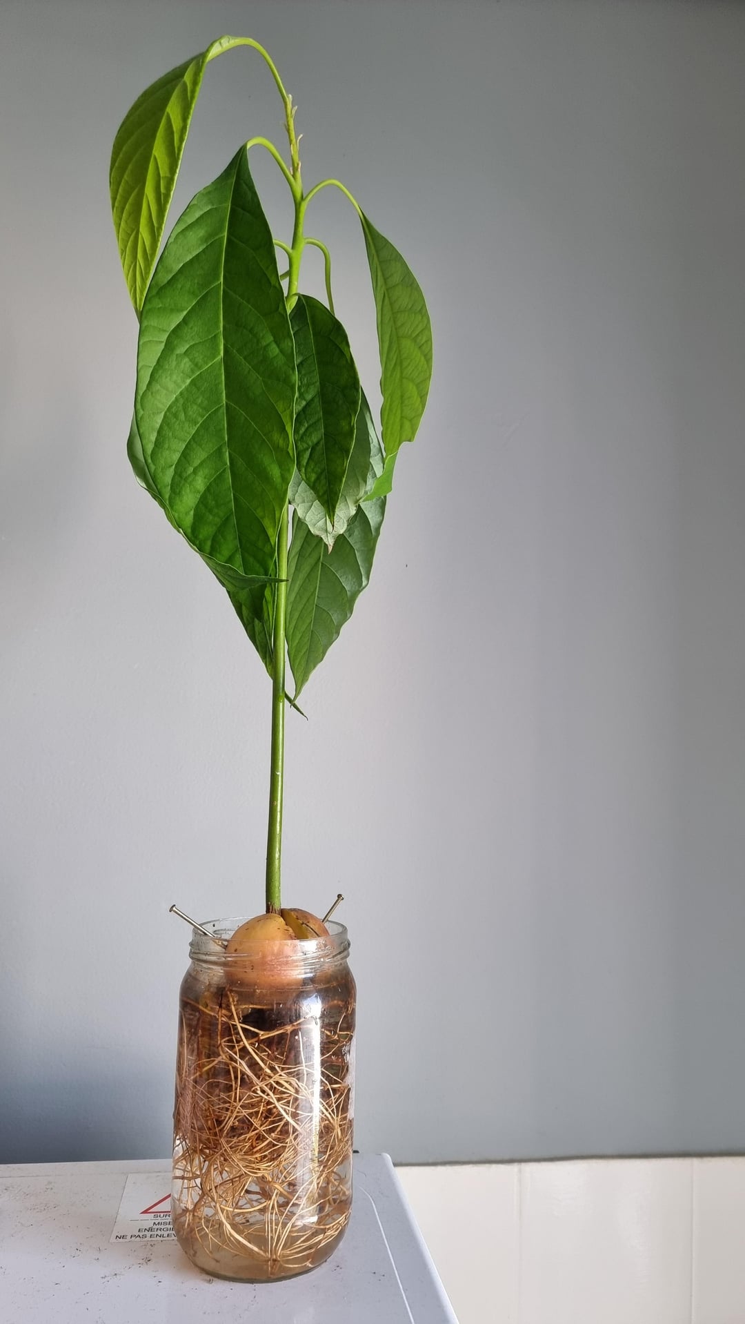 いくつかのBG Infos:私は2024年9月からこのアボカドの木を栽培しています。今のところ、彼はまだ新しい葉を栽培しています!子供の頃に何年も失敗した後、種を芽にするのは初めてでした。私は1日おきに水を完全に交換しており、サプリメントを追加しませんでした(この非常にサブのそれらを学びました)