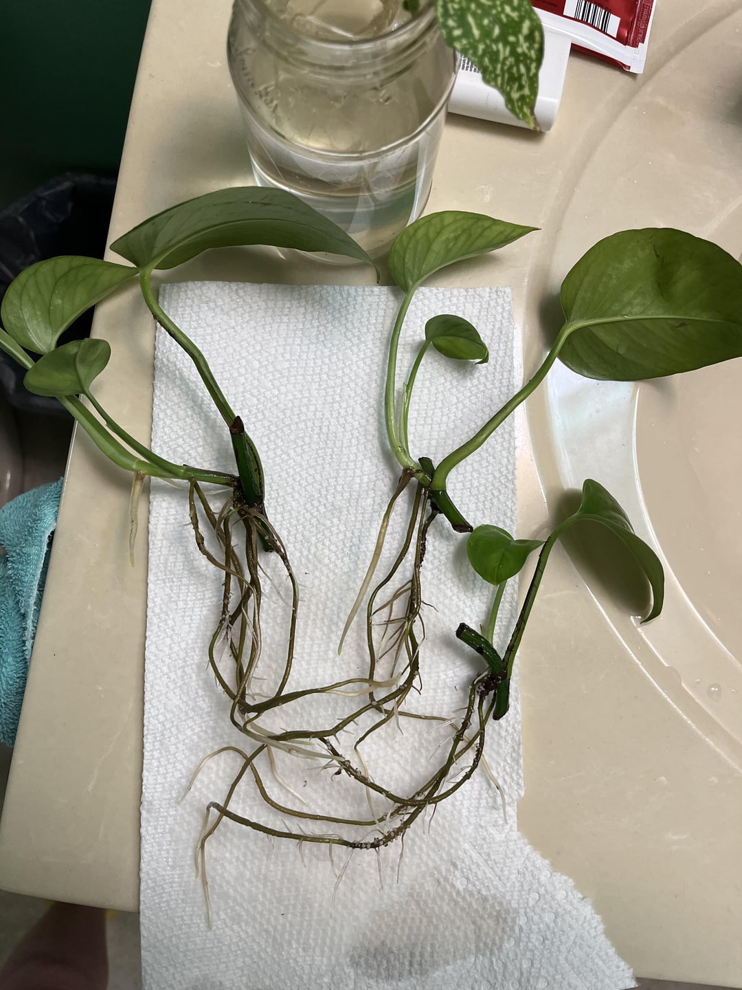 これらの挿し木は、おそらく他のいくつかの挿し木で、おそらく2か月以上にわたって水に入れられました。私は本当に追跡していませんでした、私はただ二次ルーツが形成されるのを待っていました。私はそれが必要ではなかったことを知っています、私はただポトスのために絶えず湿っているために土壌を維持する必要はありません。 だから、これらは私が今土に入れたい私の6つの挿し木です。私は分厚い土、蘭の樹皮、パーライトを自由に使うことができます。