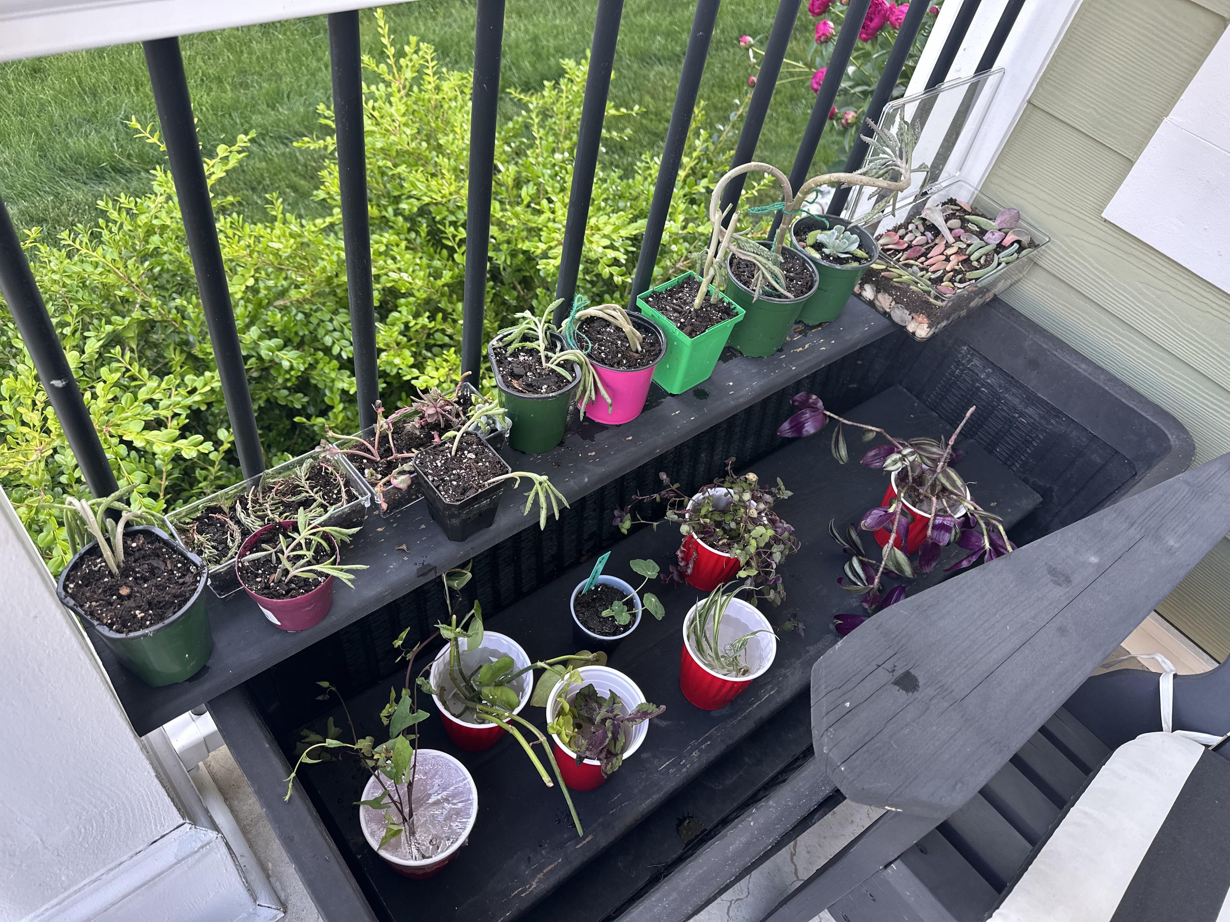 私がこの写真を撮って以来、それは大きく成長しました。すべてが本当にうまくいっています!一番上の棚はすべて多肉植物であり、一番下の棚は主に異なるヴィニング植物とコリウスです。なぜ私のシャンデリアの植物がすべて垂れ下がっているのか、それとも普通なのか、誰かが知っているのですか?