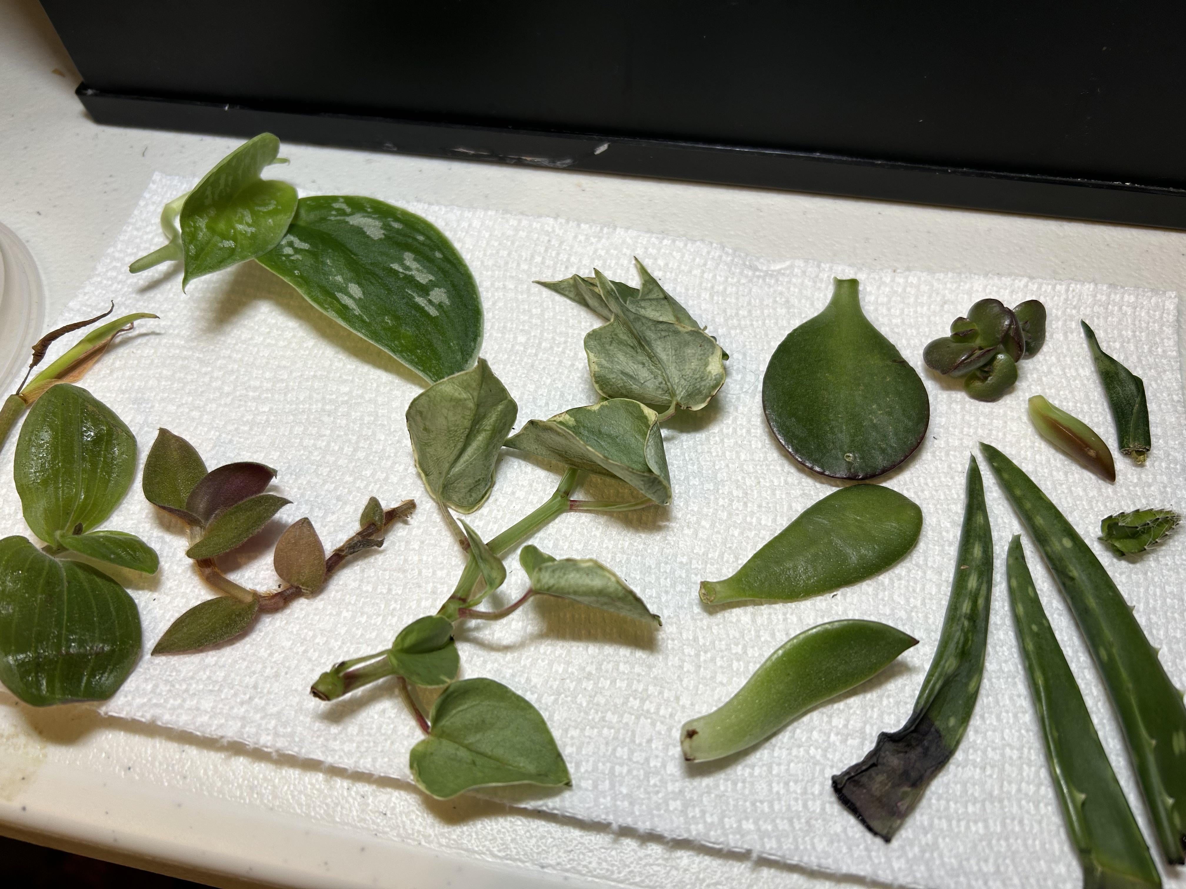 ポトス、ジェイド、アロエに興奮しました!真ん中の2つの長いものが何であるかを知っている人はいますか?わからない