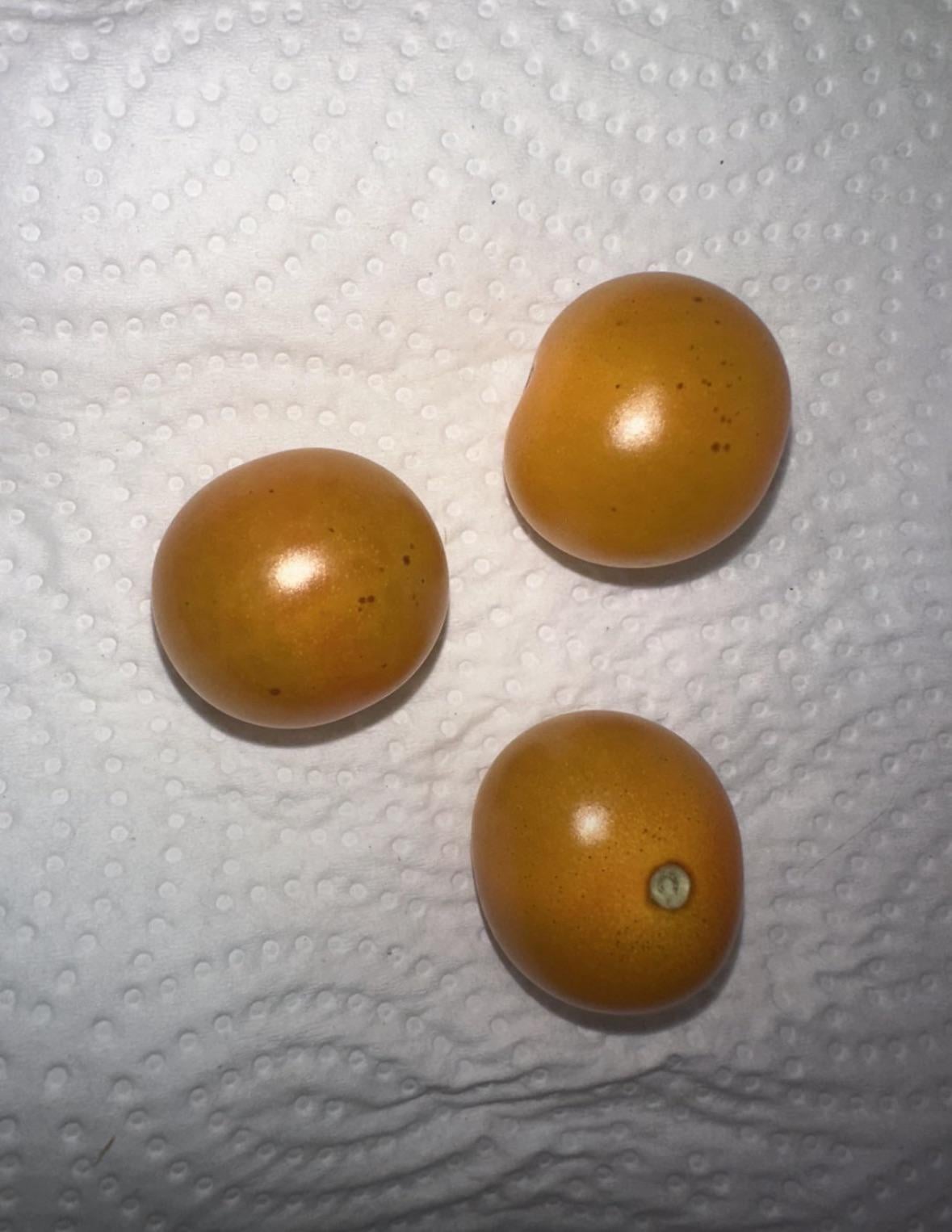 これらは、レモンチェリートマト植物から降りた最初のトマトであり、これらの斑点のある点があることに気付きました。誰もがこれが何であるかを知っていますか?