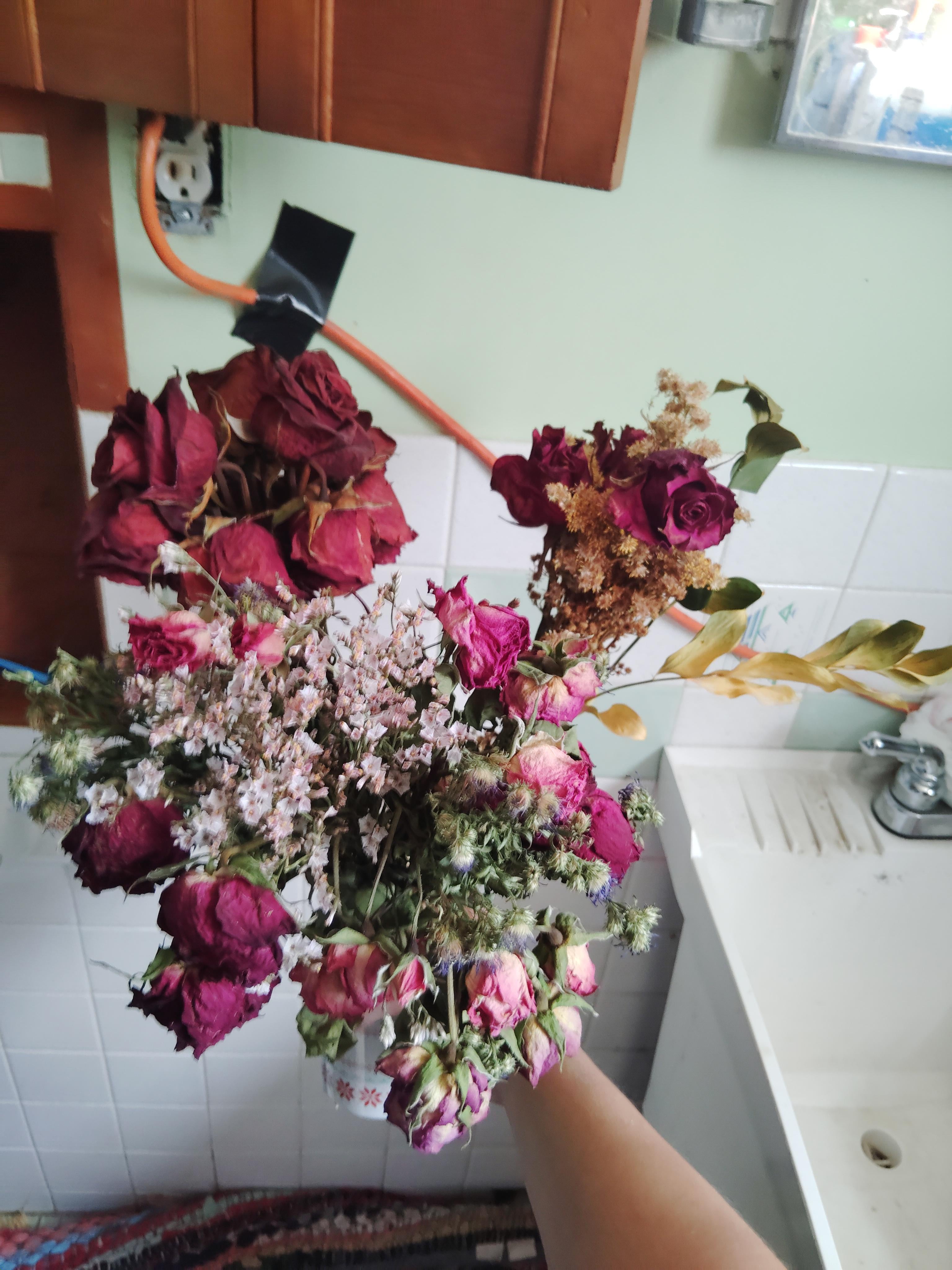 許可されていない場合は削除してください。私はこれらのドライフラワーが何ヶ月も座っていたので、私はそれらと一緒に何かを作りたいと思っています。私は本当に経験はありませんが、何でも試してみてください!(樹脂を除いて、私は樹脂を台無しにしません)あなたが持っているならあなたの提案を教えてください!これらのほとんどはバラであり、小さな花が何であるかはわかりません。申し訳ありませんが、写真は少しぼやけています、私は不安定な手を持っています。