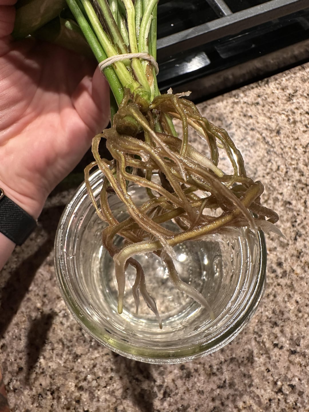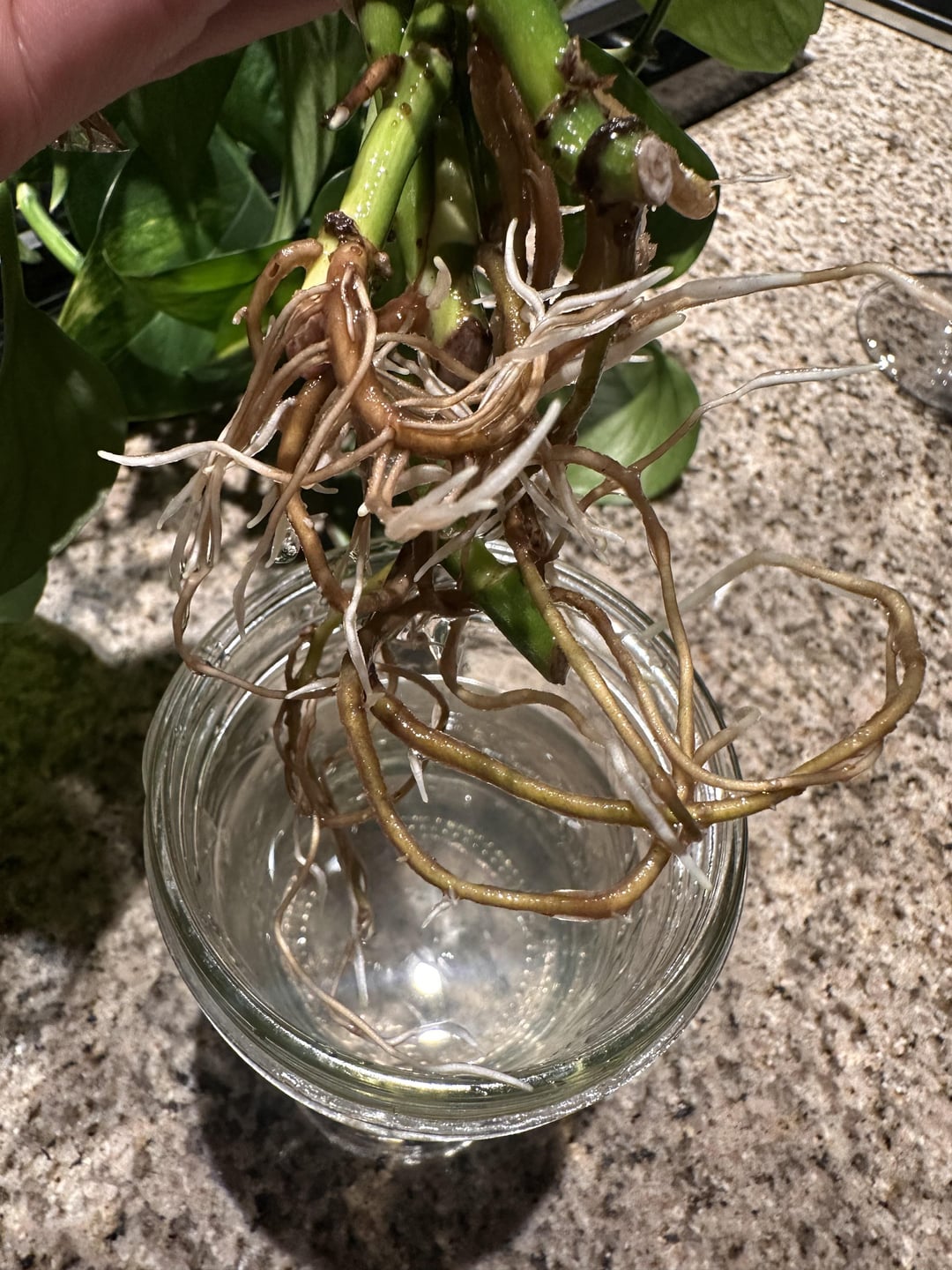 これらの根は正常に見えますか?私は5日ごとに水を交換し、いくつかのプロップドロップを追加してきました。茶色がかった色合いは私を心配しています! (2つの異なる植物)