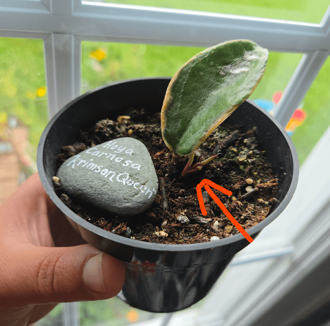 昨年の冬、私のホヤ・クリムソンの女王は、神秘的な理由で突然死に始めました。ある時点で、植物の基部が死亡し、私は単一の葉と緑の茎の小さな部分を残していたので、この小さな植物の断片を広めようとすることにしました。長い間、私が持っていたのは根付きの葉だけでした。私はそれがゾンビの葉のままであると思い始めていましたが、今日は驚きです!新しい成長!保存しました!わーい!