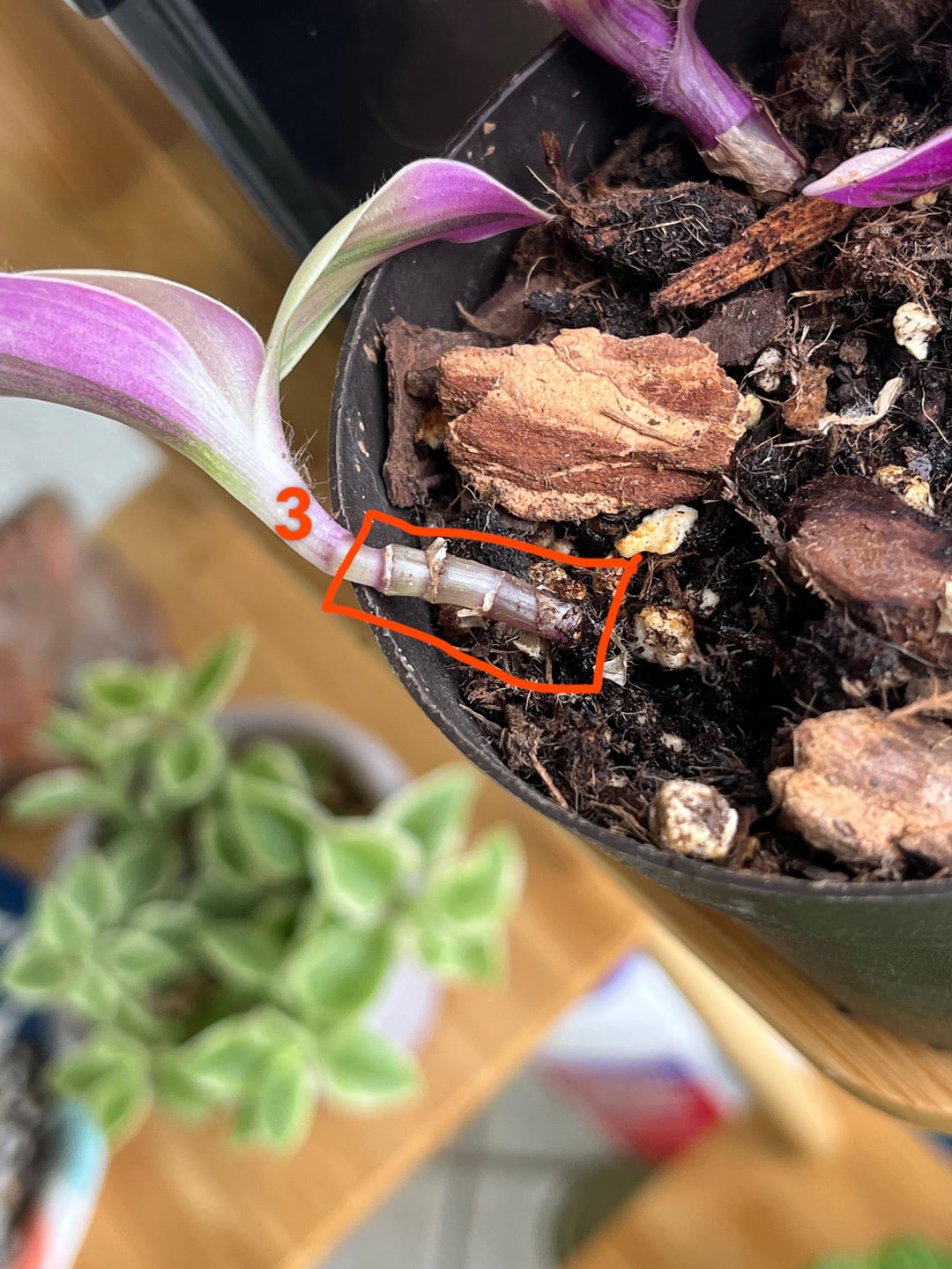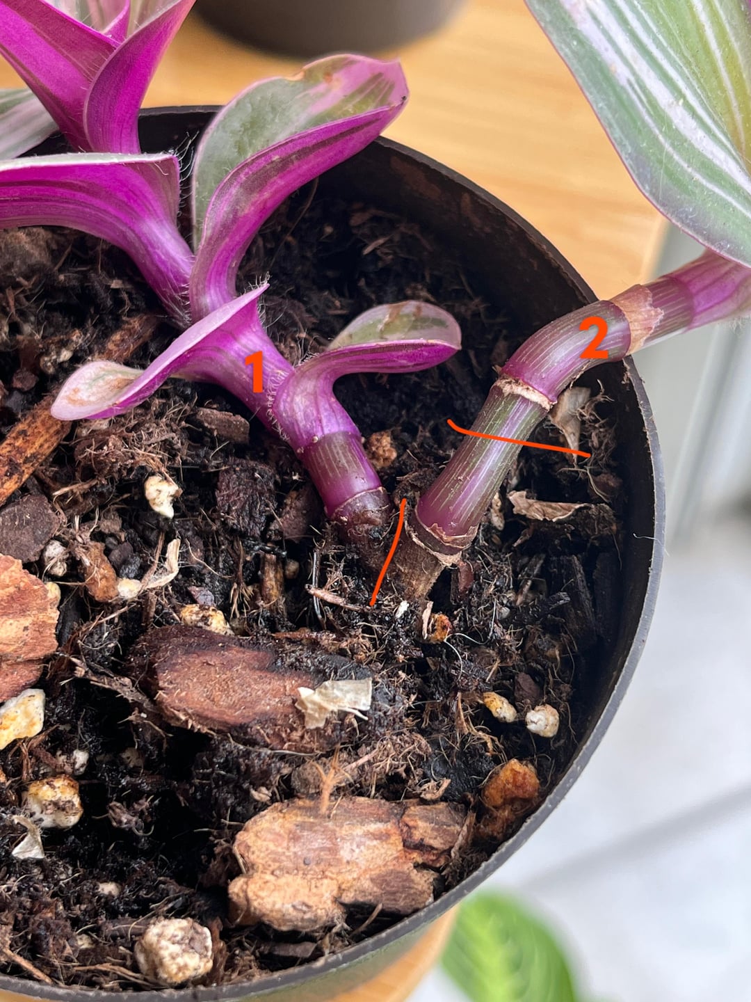(2)私の2番目の質問は同じ作品に対するものです。上部の赤い線でチョップしないが、下部でチョップすると、そのカットポイントで正しいピースに新たな成長がありますか?しかし、もし私が上部の赤い点でチョップした場合、2つのノードは、Tradescantiaのその塊を生き続けるのに十分でしょうか?