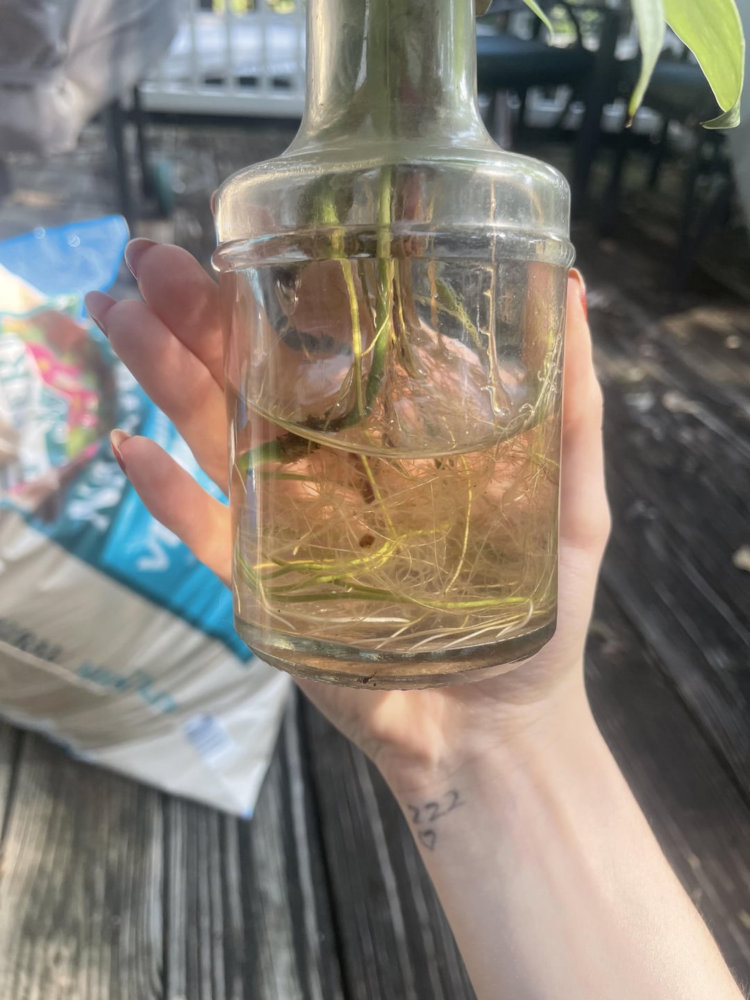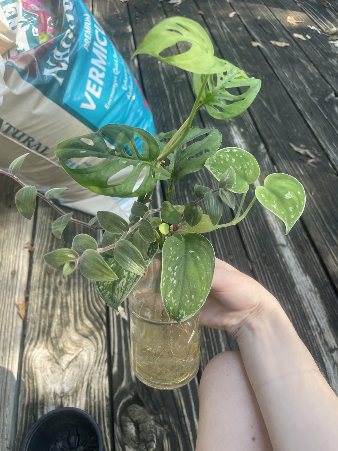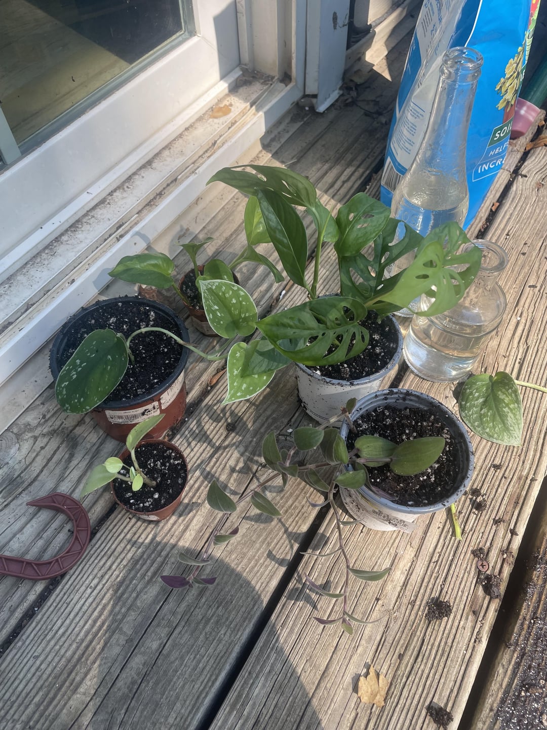 私は数ヶ月間、このボトルにランダムな挿し木の品揃えをゆっくりと収集してきましたが、根はかなり絡み合っています!今日、私はすべての植物の根を優しく分離し、それらを自分の容器に入れて鍋にしました。私はまた、私がそれにいる間に持っていた別のボトルからのグローバルなグリーンポトスだと思うものをポッティングしました!