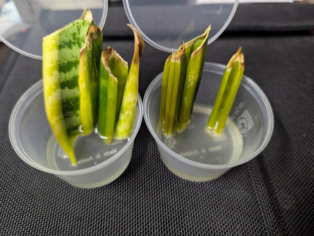 助けてください!私のヘビ植物のスニペットの上部は茶色になり、葉は柔らかくなります。右側の3つのボトムは白くてどろどろになります。 私は以前にそこに少し多くの水を持っていて、今それを減らしました。彼らは行き過ぎていますか?