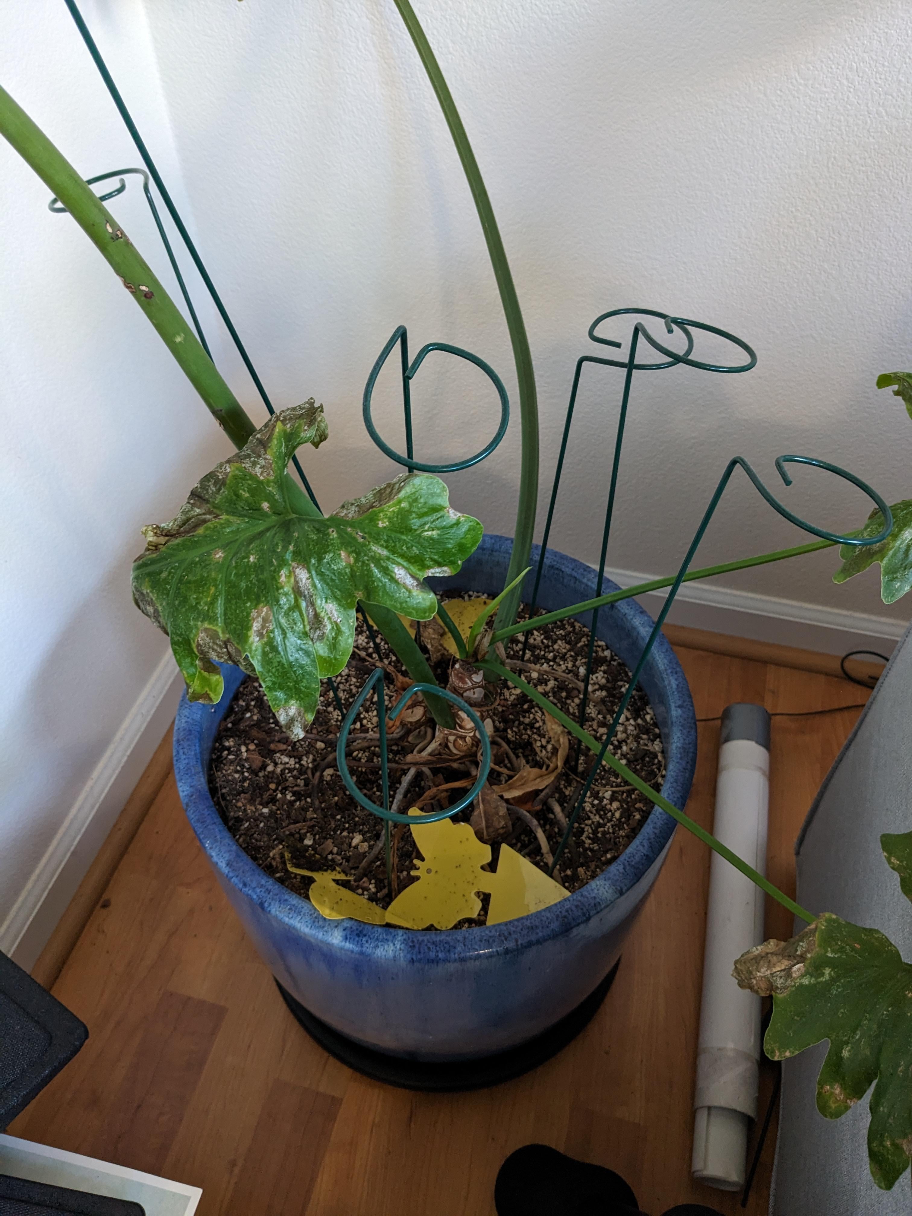 これは分葉のフィロデンドロンだと思います。 残っている葉はすべて傷んでいますが、それでも新しい葉を押し進めています。 近所の人は、アブラムシだと思って最善の処置をしたと言いました。 このまま注意深く検査と治療を続けるべきか、それとも切断して支柱を立てるべきかわかりません。 今のところ、この植物は他の植物から隔離されています。
