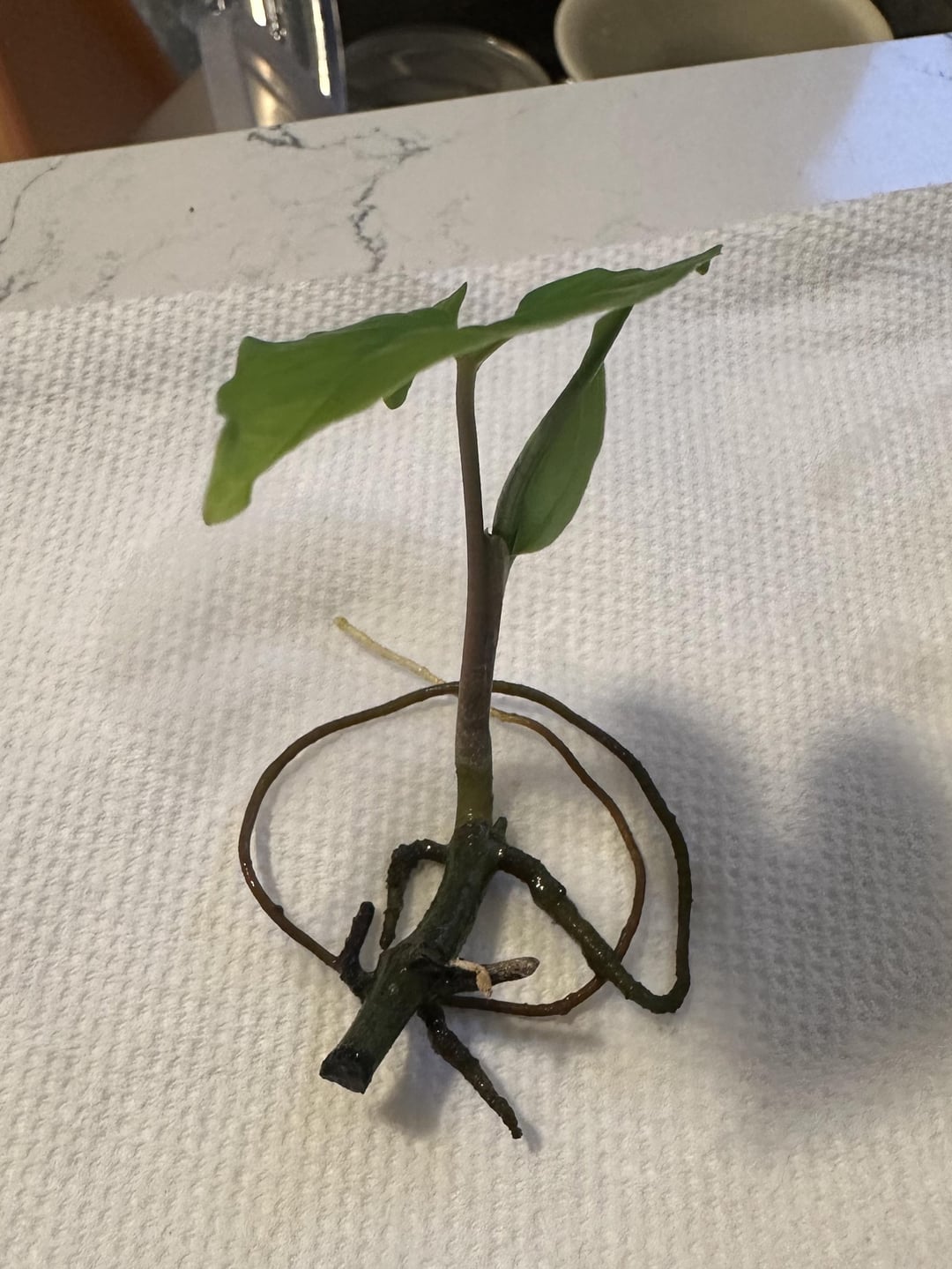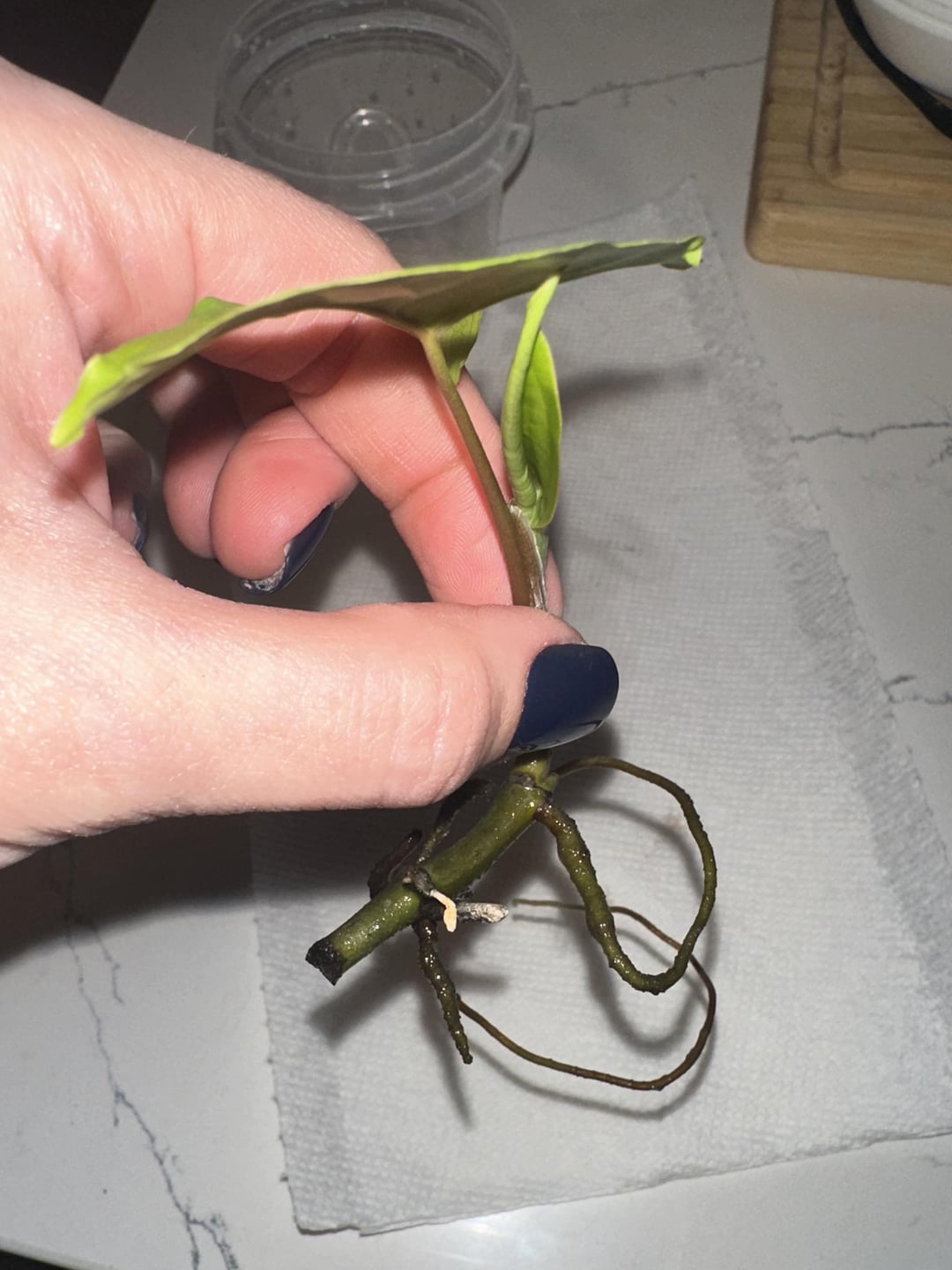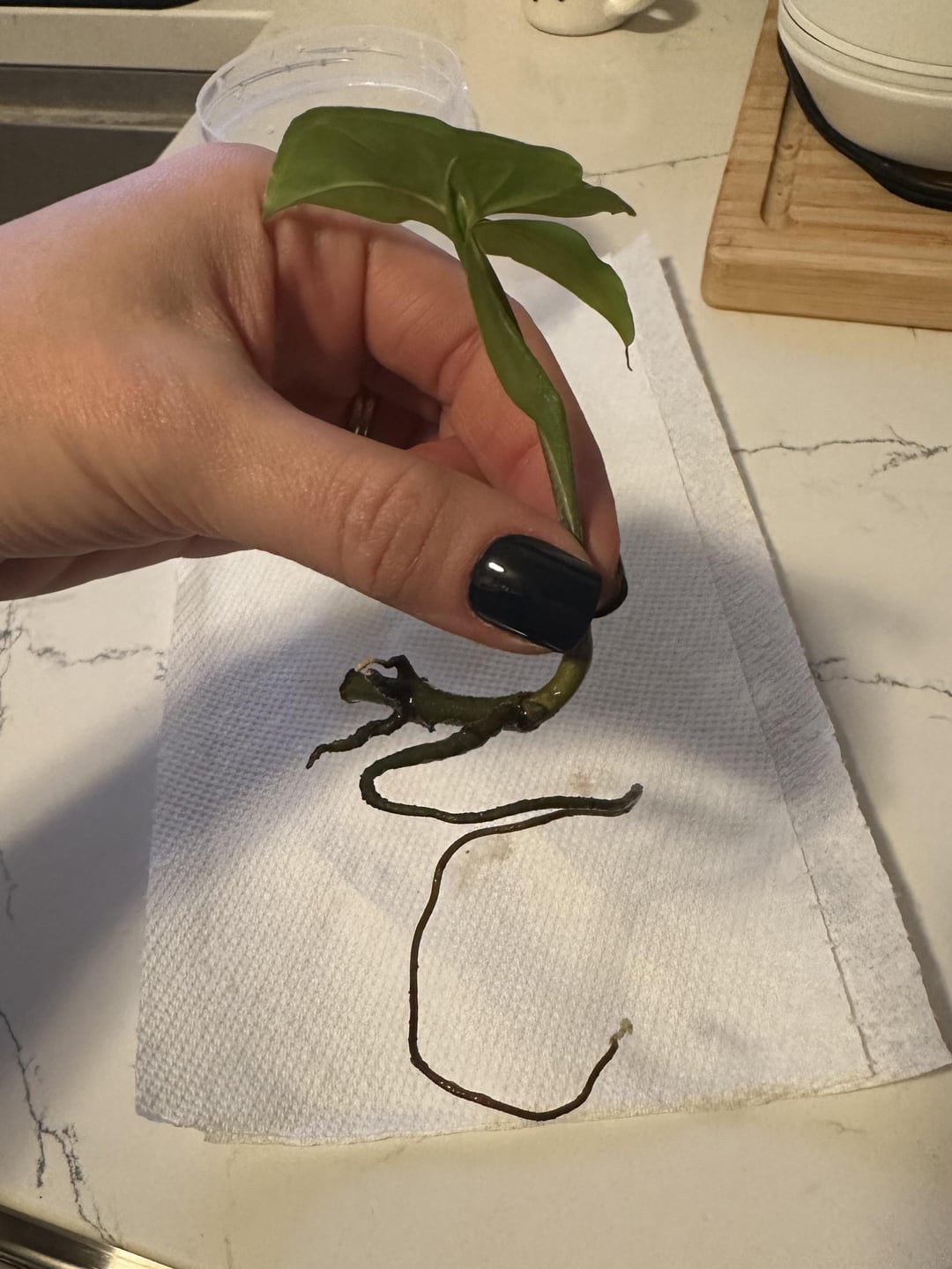 この小さな矢印の切断(Syngonium podophyllum)は、誤ってより大きな植物から引っかかって以来、小さな水の容器でそれを持っていました。それは非常に長い単一の根を栽培しており、元の植物から落ちた後、2番目の葉を発芽させました。土壌に植えても安全ですか、それとももっと時間を与えるべきですか?鍋に植えるためのヒントは大歓迎です!