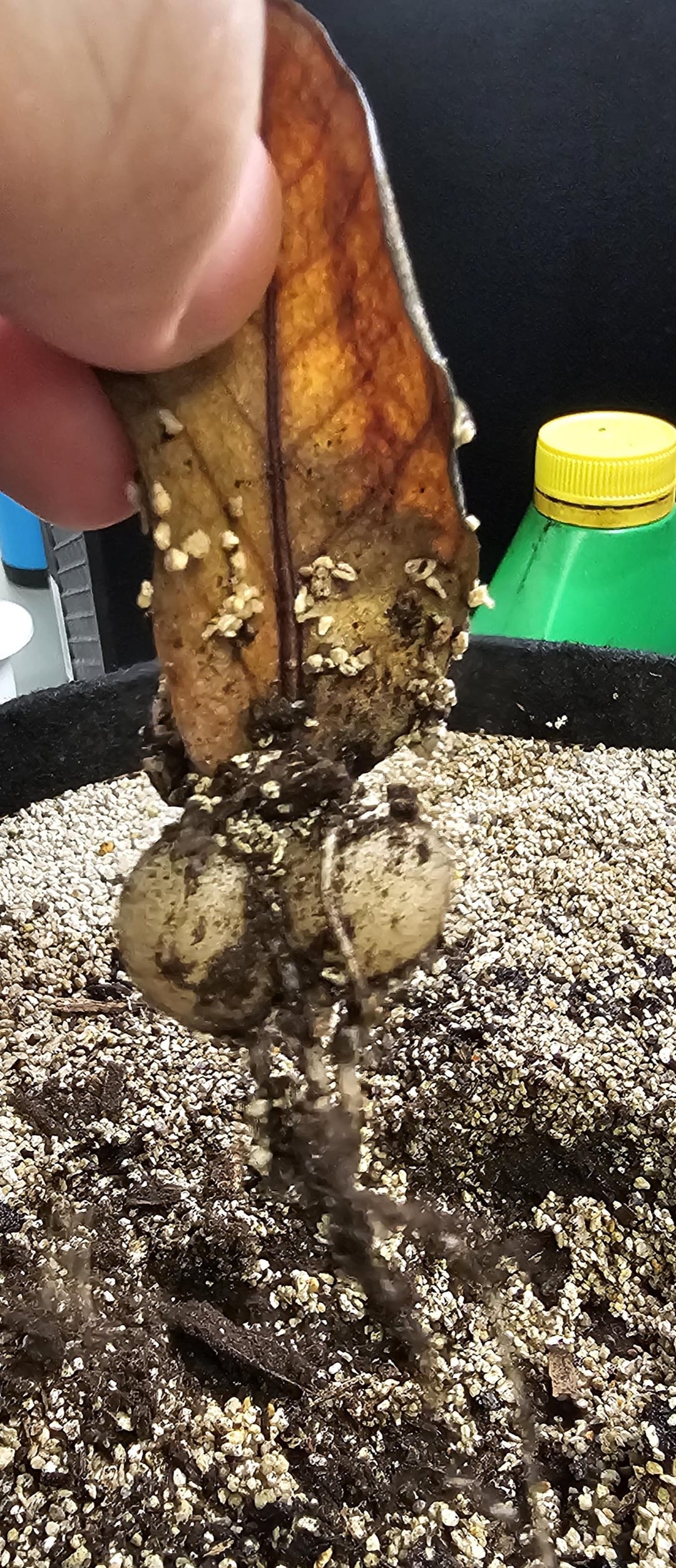根が生えるまで数枚の葉を水に浸しました(成功したのは2枚だけ)。 数か月間土の中で緑色を保っていた葉が枯れるのを見て落胆しましたが、葉を引き抜きに行ったときに驚きました。 根を傷つけすぎてストレスを与えていないことを祈ります。