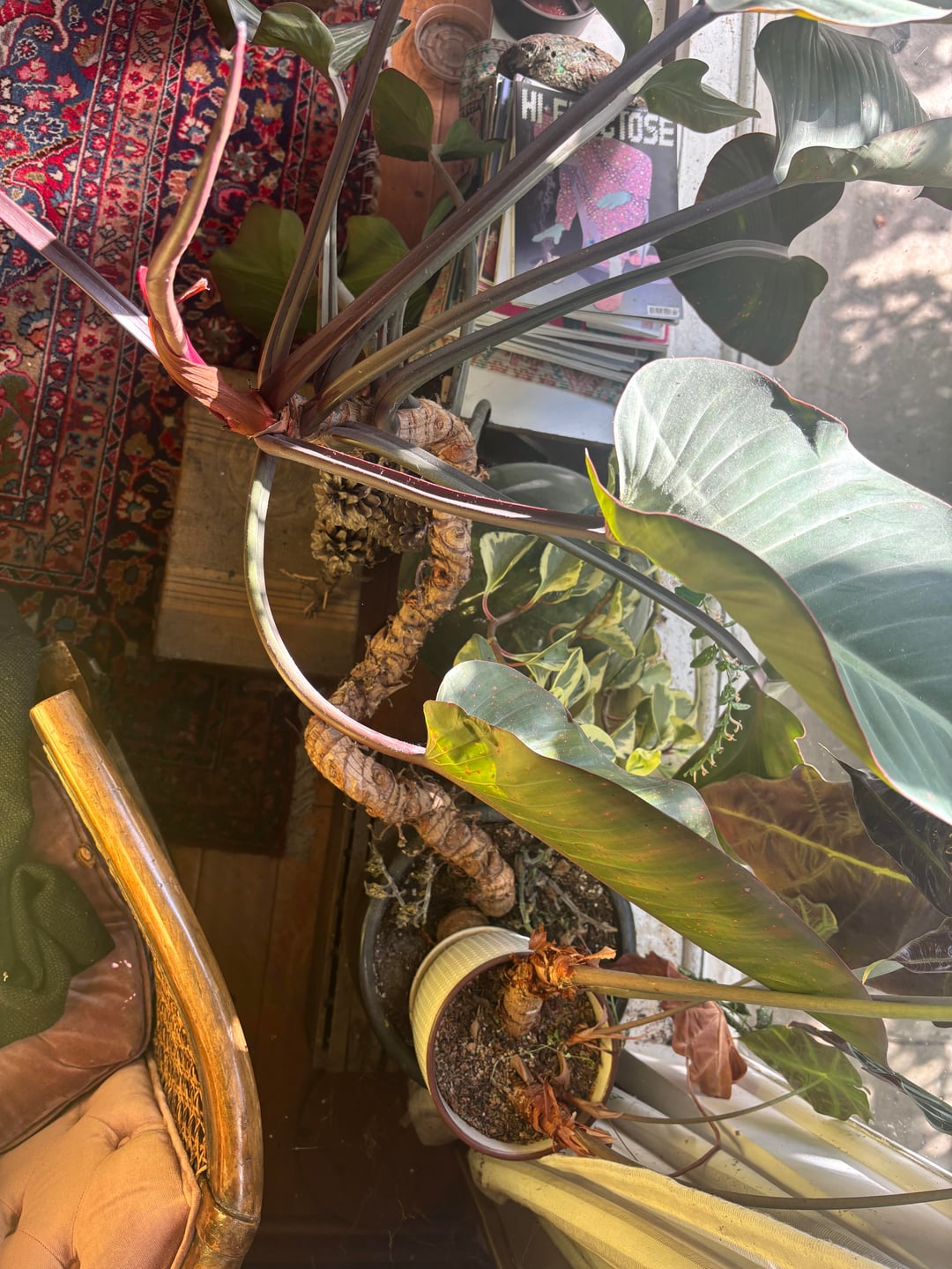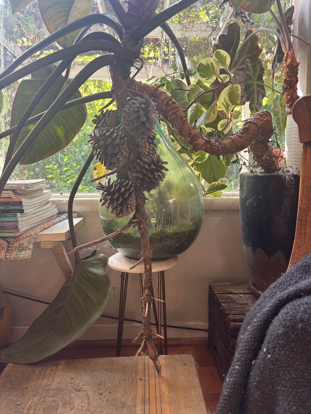 私は長年にわたって持っていた非常に大きな植物を持っています。私はその長い茎をサポートする方法でかなり創造的にならなければなりませんでした。過去数年間、私は植物のバランスを貼り付けましたが、松ぼっくりが付いていますが、公式に成長し、古いトランクを下に置かなければならないと思います。私は天井から何かを停止することを考えましたが、私はよくわかりません。どんな提案でもスーパー…