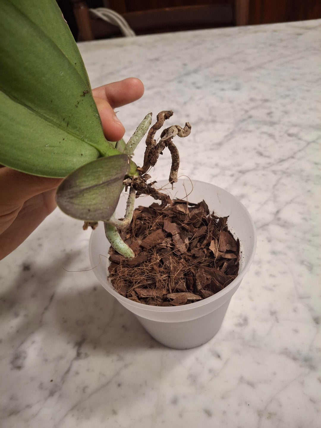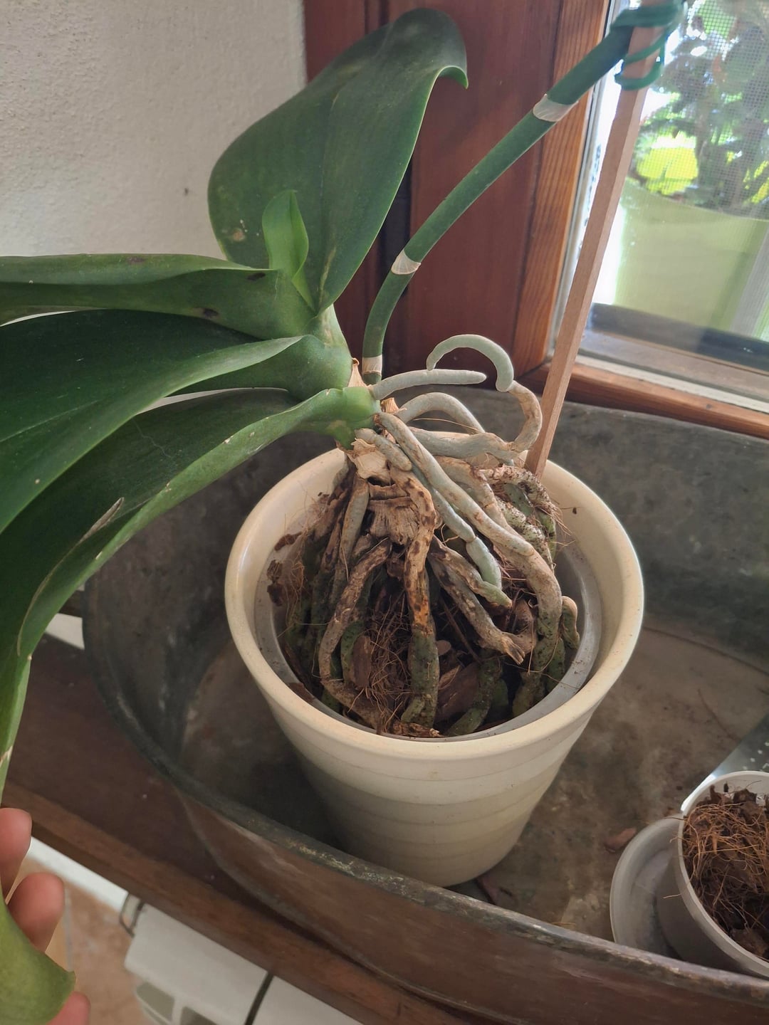 私の蘭は死にかけています。 1つには根が残っていません。もう1つは2つしかありません。私はそれらを特別な基板に置いて、時々軽く水をまきました。2番目の基板が気に入って、新しい根を伸ばし始めました。しかし、最初のものは長い間苦労してきました。根腐敗で購入し、小さな鍋に入れました。それが十分に根を伸ばしたとき、私はそれをより大きな鍋に移動しましたが、それから再び腐ったのです。たぶん、ポットがまだ大きすぎました。今では根が残っていないので、もう何をすべきかわかりません。私は私の別の蘭の写真を共有します。私はほとんど世話をしていません。