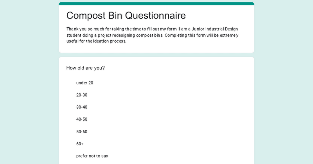 こんにちは、私は現在、家の堆肥化に関連するプロジェクトに取り組んでいる工業デザインの学生です。私の調査に記入できれば、大歓迎です!ほんの数分しかかからず、私を非常に助けてくれます。ありがとう。