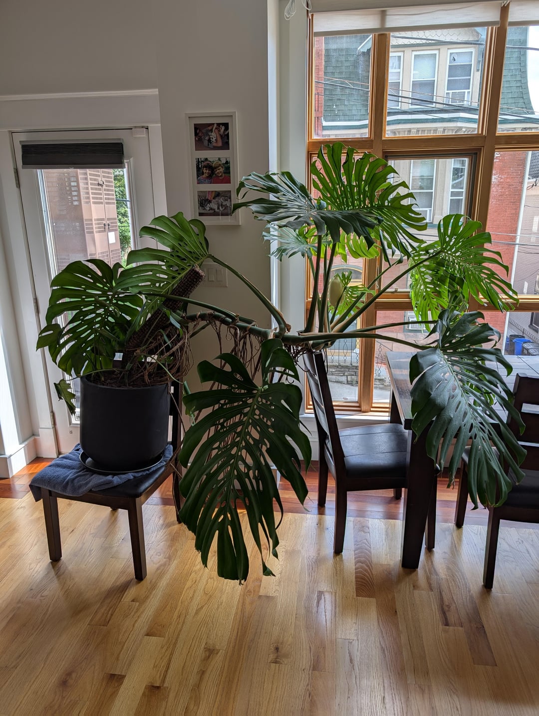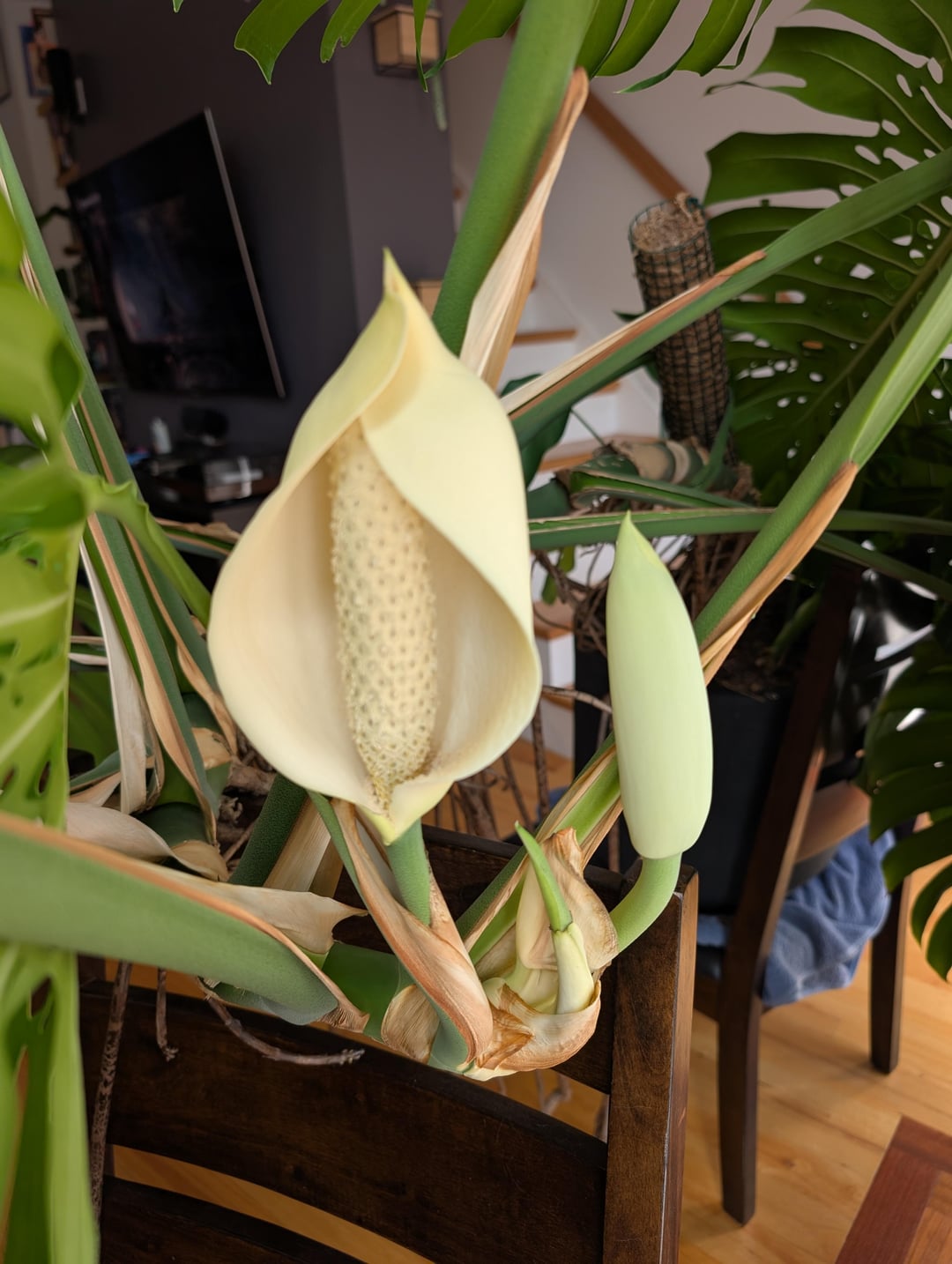 最初の花が入ったとき、私はショックを受け、その後1週間後に2番目の花も飛び出しました!私はこれに値するために何をしたか分かりません、私は非常に忘れられない植物の親ですが、私は驚くべき光のある魔法の窓があります。また、私はポット/椅子/テーブルの状況がばかげていることを知っていますが、このことはそれを試してみようとするよりも速く成長しています。 植物は約3年前のもので、パートナーの母親の植物から葉を切って栽培されていますが、現在は彼女の悔しさよりもはるかに大きくなっています。