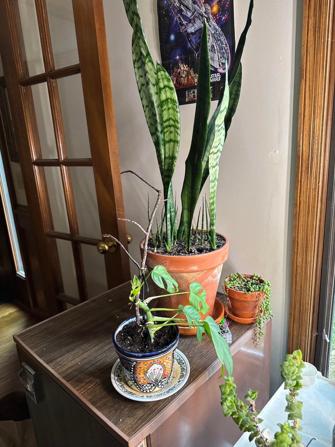 前の植物が何であるかを知っている人はいますか?コミュニティカレッジの園芸プログラムが4ドルで成長したものを販売するイベントでそれを手に入れました。その中にあったタグは、それがホヤ(2番目の写真)だと言っていましたが、私はこのような穴がある葉が葉にあるのを見たことがありません。私の植物識別アプリは、それがスイスチーズの怪物であると言っていますが、この薄緑色やこの形状の穴があるのを見たことがありません。それは本当に若い植物ですが、多分それは後でそれに変わるのでしょうか? (また、茎の曲率を嫌わないでください、これは私の最初の登山と非サボテンまたは多肉植物の植物であり、今日まで彼らがサポートが必要だとは知りませんでした)
