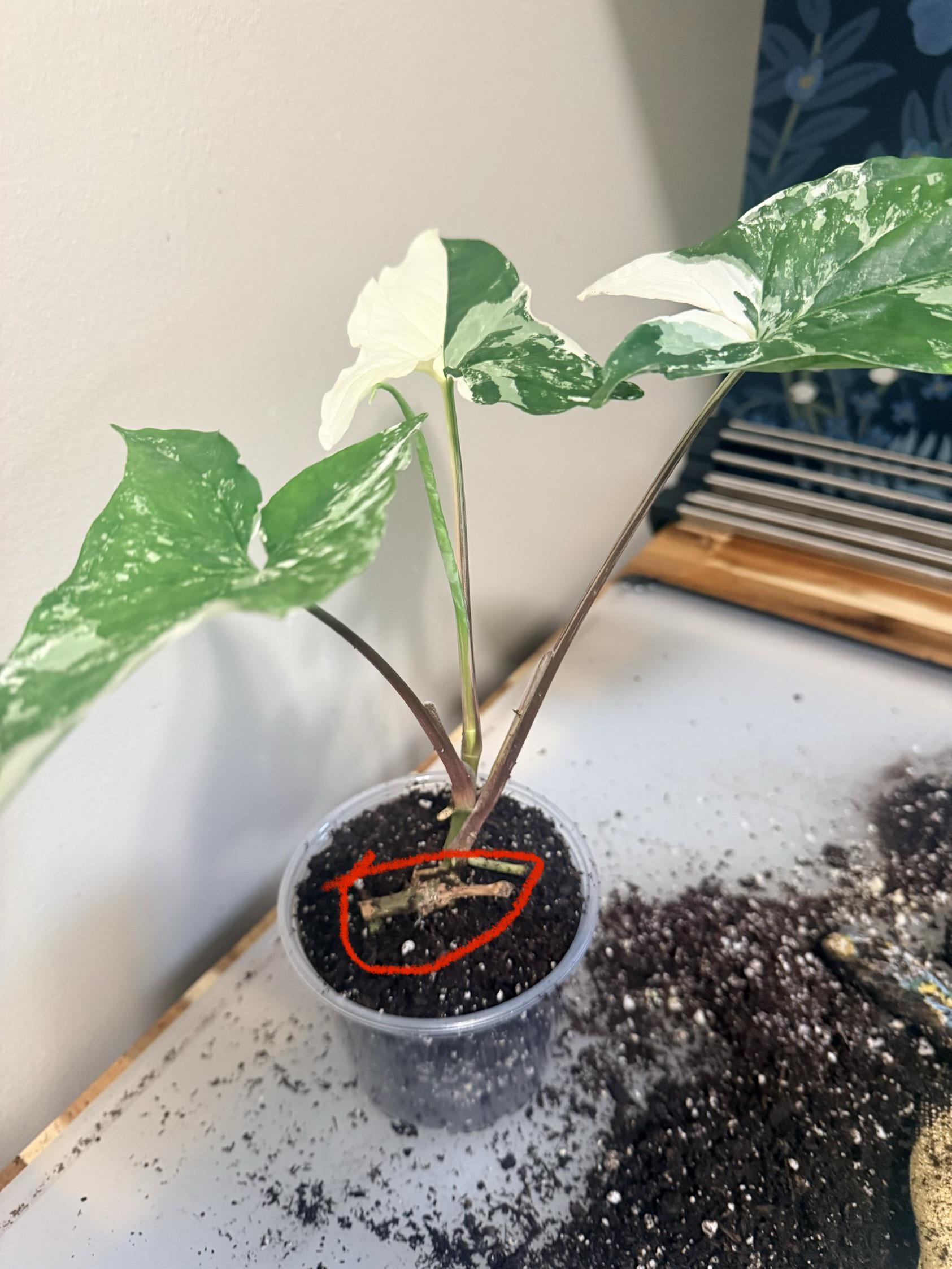 私は新しい植物の親なので、親切にしてください。しかし、私はこのシンゴニウムを手に入れました。丸で囲まれた部分が汚れの下にあるべきかどうかはわかりませんか?