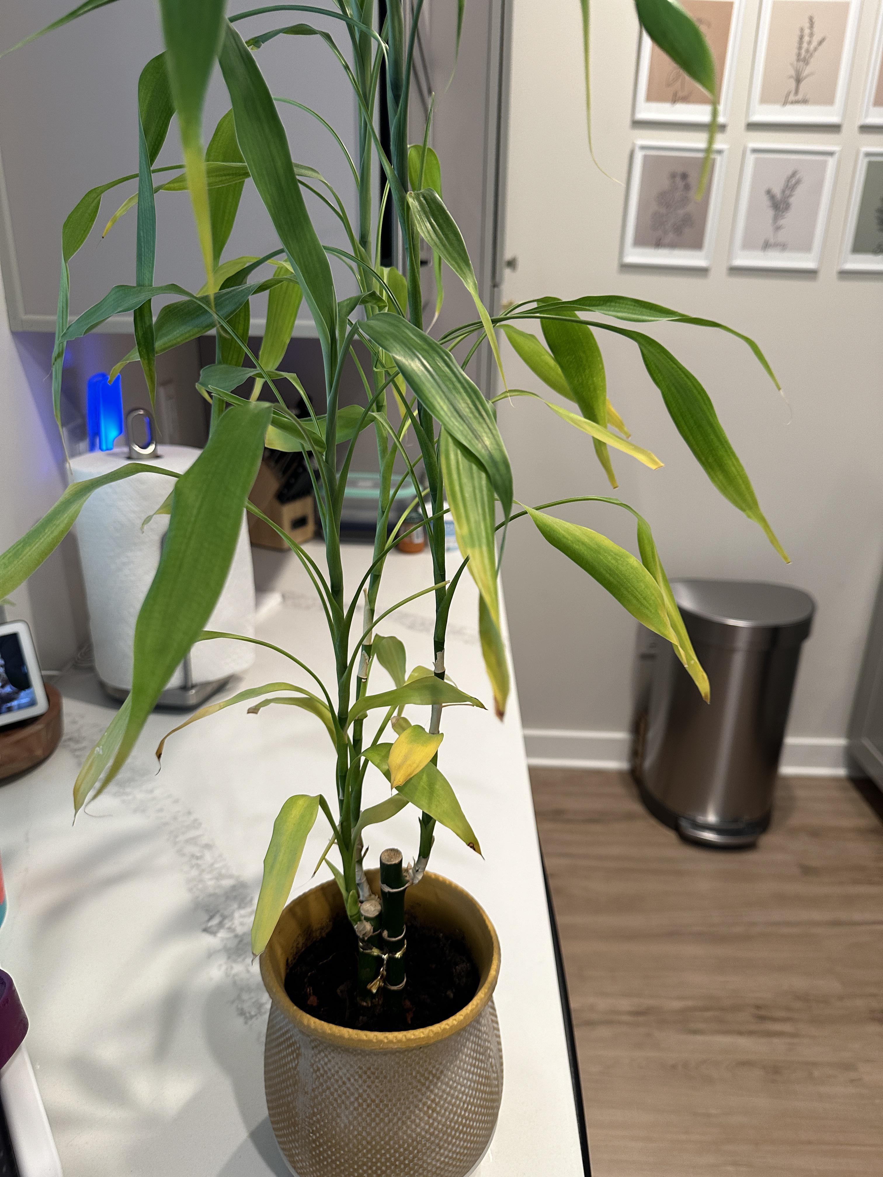 今年の5月、私は幸運な竹の植物を岩から土に移しました。ヒントが少し黄色で、植物が垂れ下がっている理由を教えてもらえますか。 当初、私は、植物が常に水中にあったので、岩にあったときに根に腐敗していると思います。しかし、今、私は土に移動したので、私はおそらく1週間おきに水を湿らせ、土を湿らせるのに十分です。 それはまだ水が多すぎると考えられていますか?垂れ下がらずにこの鮮やかな緑を作るにはどうすればよいですか?