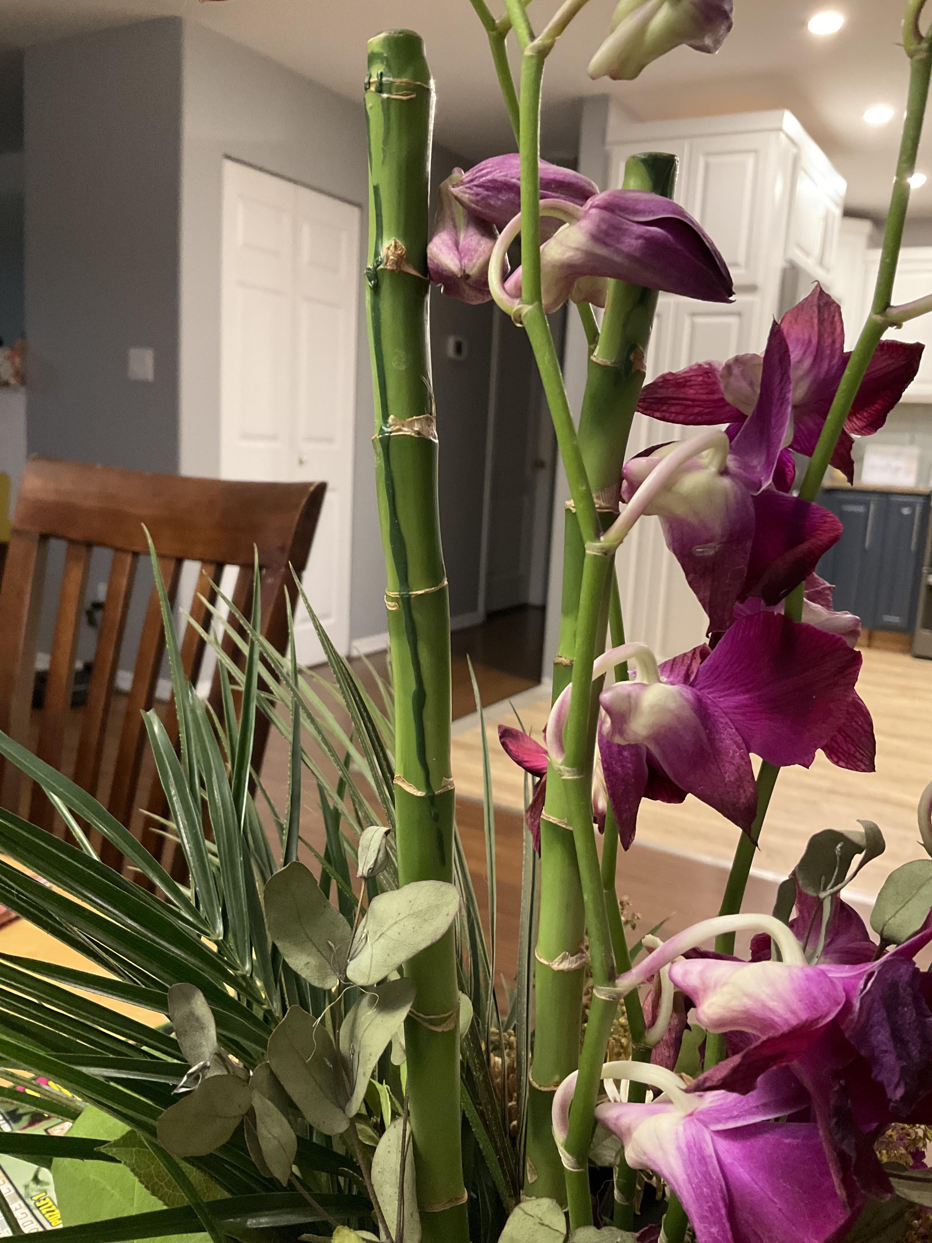 私はその一部を観葉植物として保持したいと思います。竹は、ラン、菊、カーネーションはすべて切り花であるため、それを行うのが最も簡単な作品になると思いますが、上部にワックスで密封され、花式の泡の角度でカットされています。この竹をこの状態で支えることさえありますか?
