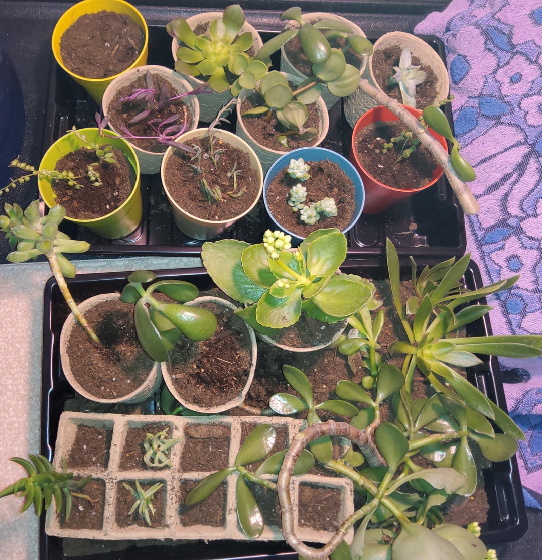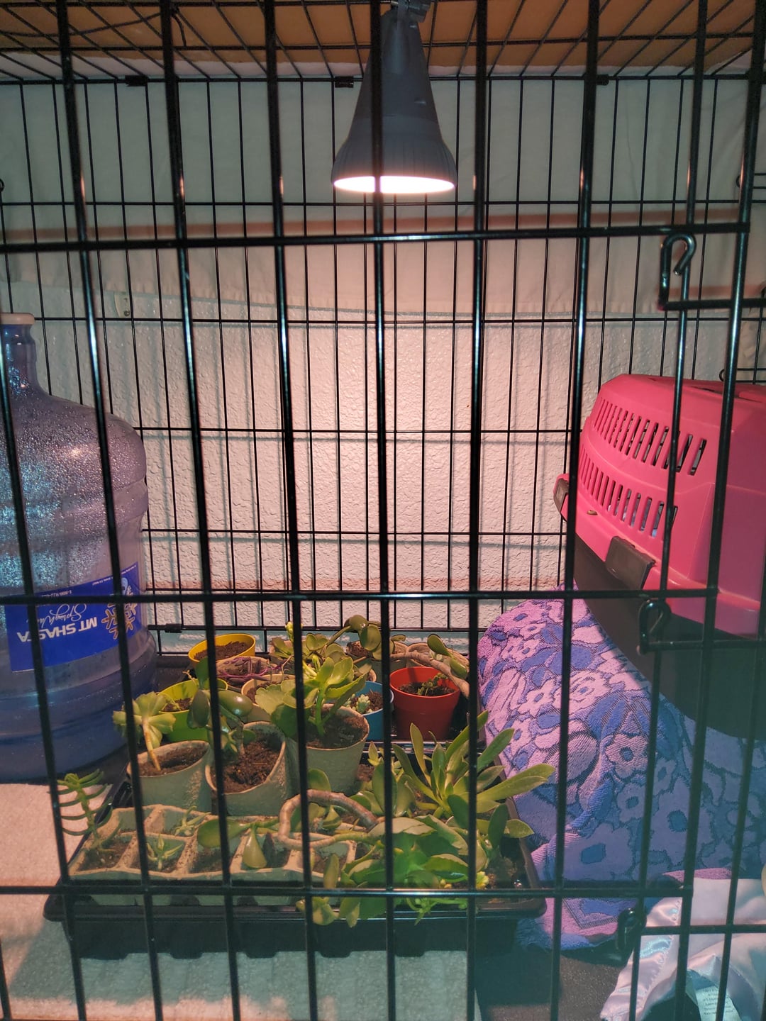 約3週間半前に友人がかなりの数の挿し木をくれました。 他に猫から離す場所がなかったので、蓋の緩いゴミ箱に入れて土の上に置きました。 私は西向きのパティオを持っていますが、ここカリフォルニアでは雨が降ったり止んだりしているため、夏には5〜7時間ほど太陽がよく当たります。 これ以上放っておくと生きていけないのではないかと心配したので、大きな鉢が買えるようになるまで、何年もクローゼットにしまっていた小さな鉢にサボテンの土を入れました。 私はウォルマートでグローライトを購入し、バスルームにある里子猫の隔離ケージに吊るしました。 バスルームには窓がないのでいつも暗いので、一晩つけっぱなしにして昼間は消します。 スプレーや水やりに関して矛盾した情報を見つけましたが、この時点でどのように世話をすればよいですか? お願いします、そしてありがとう!