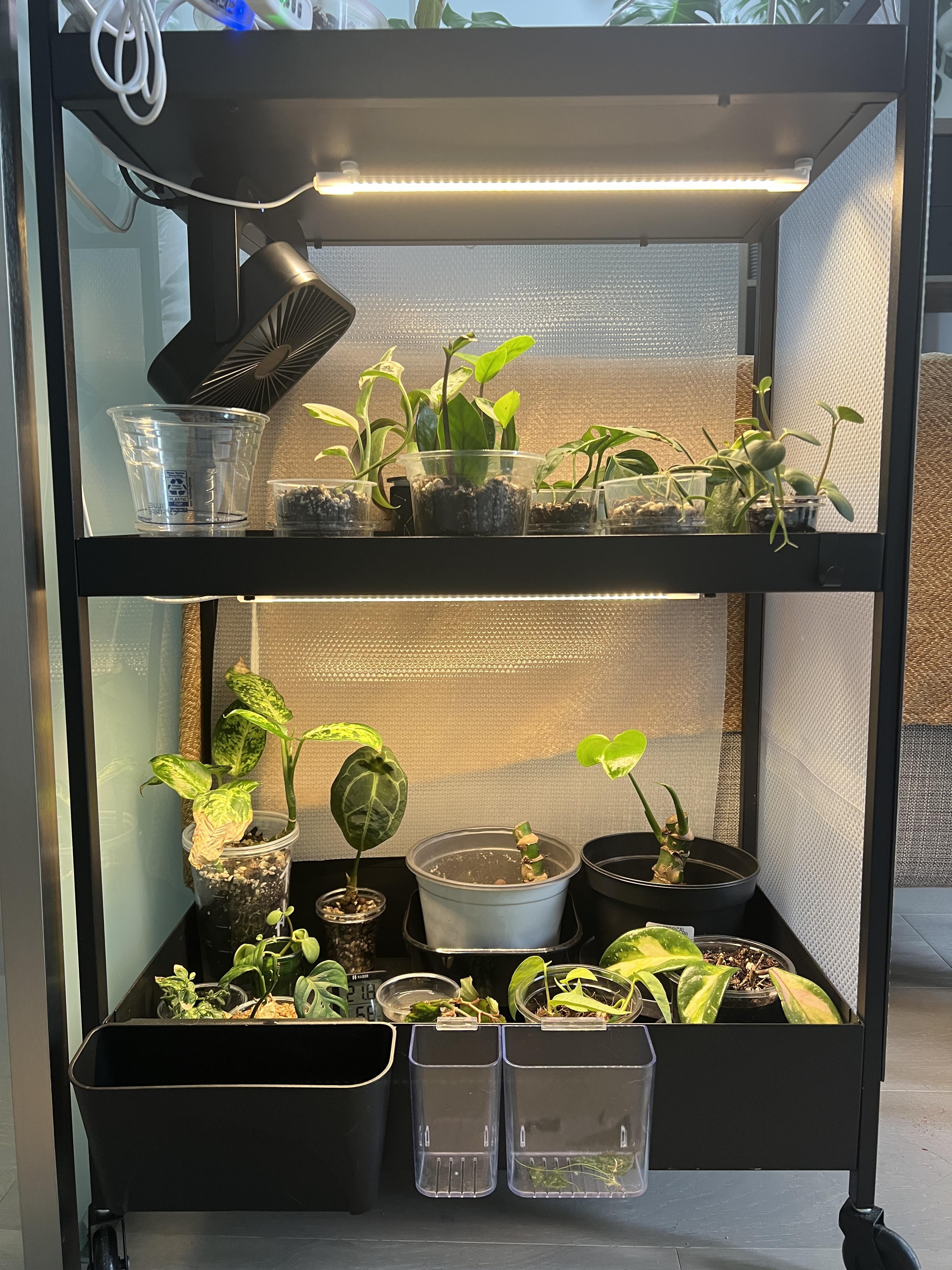 これまで、私は磁気ファンだけを購入し、軽いストリップと粘着性の磁気ストリップを育てました。側面を覆うために、磁気ストリップに貼り付けられた古い引き出しライナーを使用して、簡単に削除できるようにしました。私はまだ他の2つの側面を隠すために何かを見つける必要がありますが、私の部屋の温度と湿度は恐ろしくないので、私はただ予算のような何かを見つけるために時間をかけて見つけることができます。メッシュシェルフは、空気の流れを底の棚に導くのに役立ちます。雨季に繁栄する私の赤ちゃんの植物を楽しみにしていることにとても満足しています。