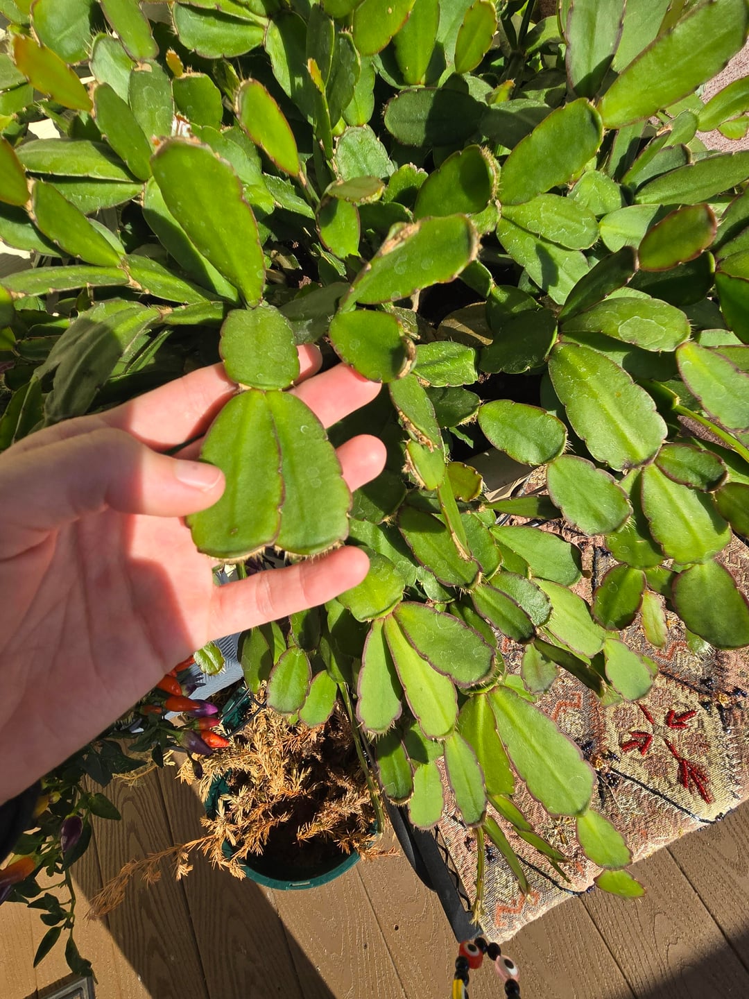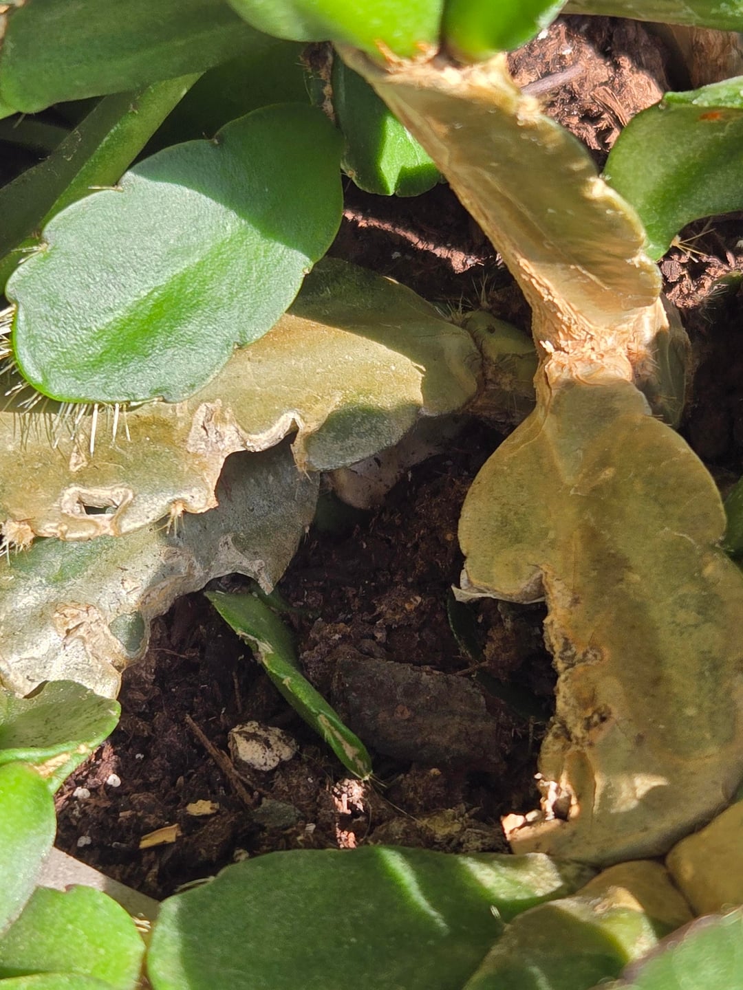 私の夫のgreat祖母は、彼女がもはやそれの世話をすることができないので、私に彼女の最愛のサボテンをくれました。彼女は、かつては常にピースを切断して人々に与えると言いました、そしてそれは毎年咲きます。私はそれがイースターサボテンだと信じており、彼女はそれが非常に古いと言いましたが、それの年齢を知らない。これは、そこの中央でコーキングしているのでしょうか、それともある種の真菌でしょうか?