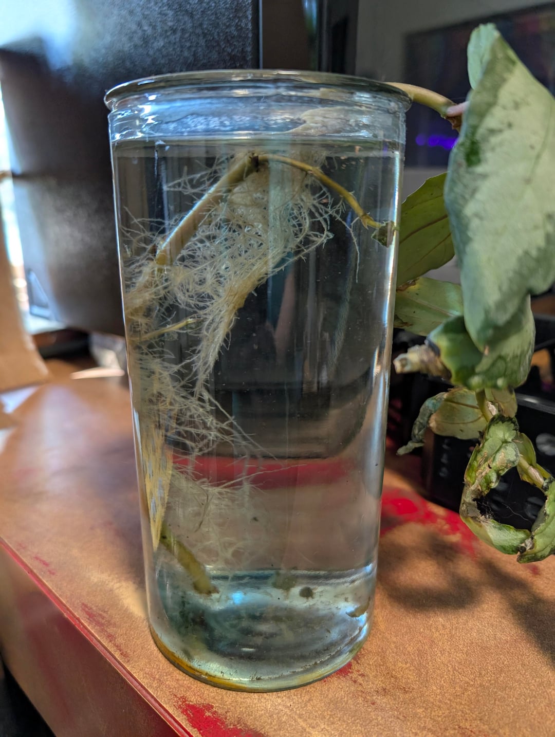数か月前にウォルマートの地面でこの切断を見つけましたが、それ以来ずっと窓枠に座っていました。最初はいくつかの良い進歩を遂げた後、猫がそれに到達したので、猫がアクセスできない窓辺の角に移動し、水を覆う以外に少し無視しました。それが何であるかわからないのですが、今のところはたくさんのルーツがあるのでチョップを与えるつもりだと思います。窓からの太陽が十分ではない場合、私はそれを下に置くことができる小さな成長光を手に入れましたが、将来どのような注意を払うべきですか?それは南向きの窓にあり、おはようの太陽が降りますが、日が木の後ろに隠れていると、3番目の写真が窓全体のビューです。おそらく十分ではないことは知っていますが、現時点でできる最善のことです(屋内の温室とその他の明かりが得られるまで、段ボールが猫の校正のためにあります)