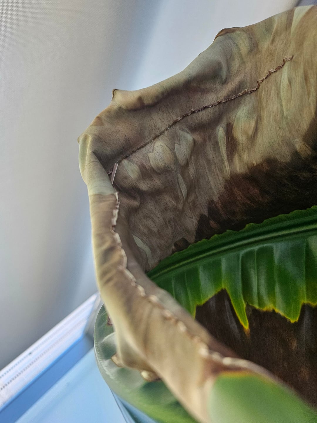 私は6日後に戻ってきましたが、植物ははるかに悪く見えます。茶色/黄色の斑点といくつかのベージュの紙の乾燥セクションの荷物。