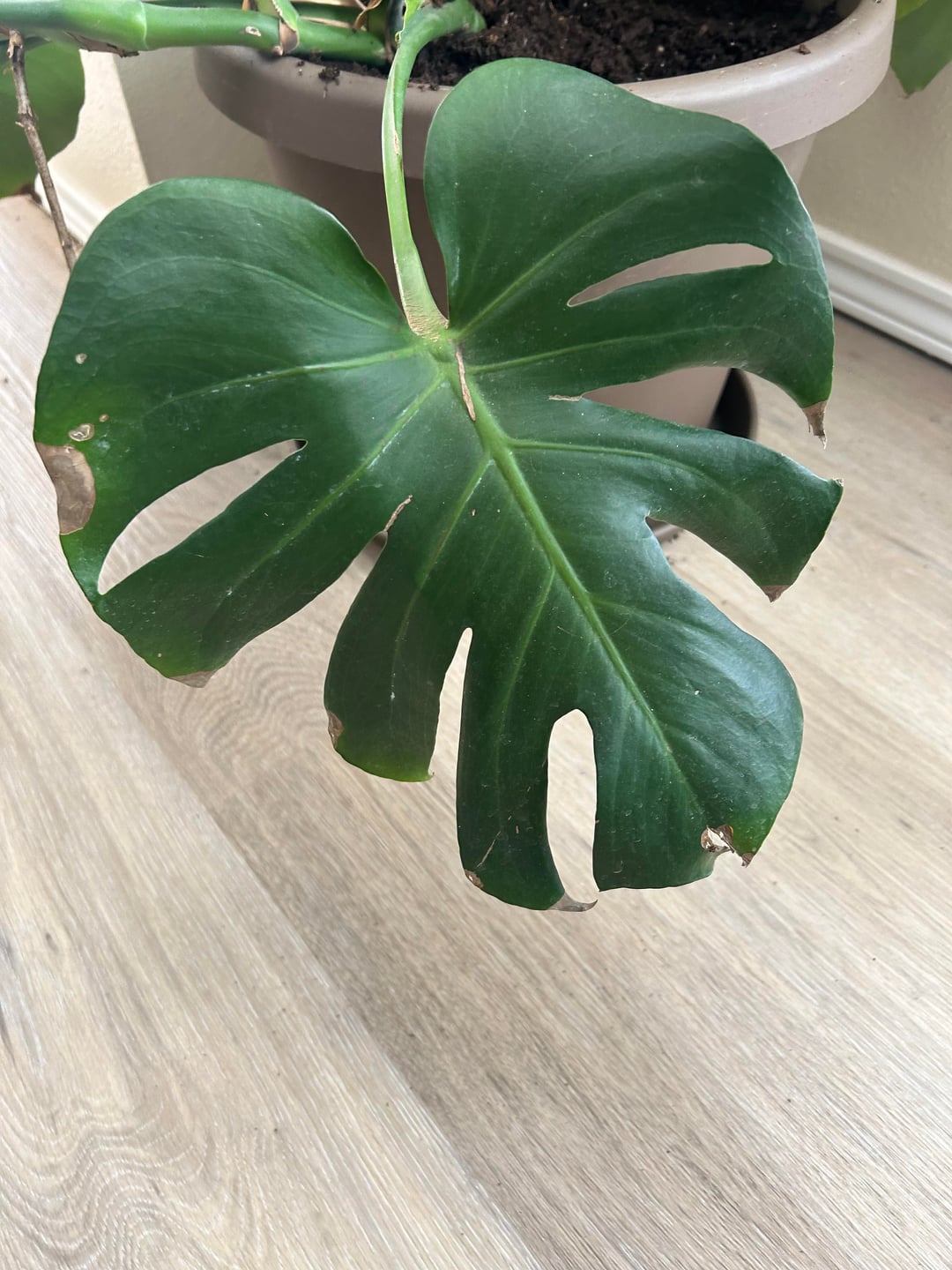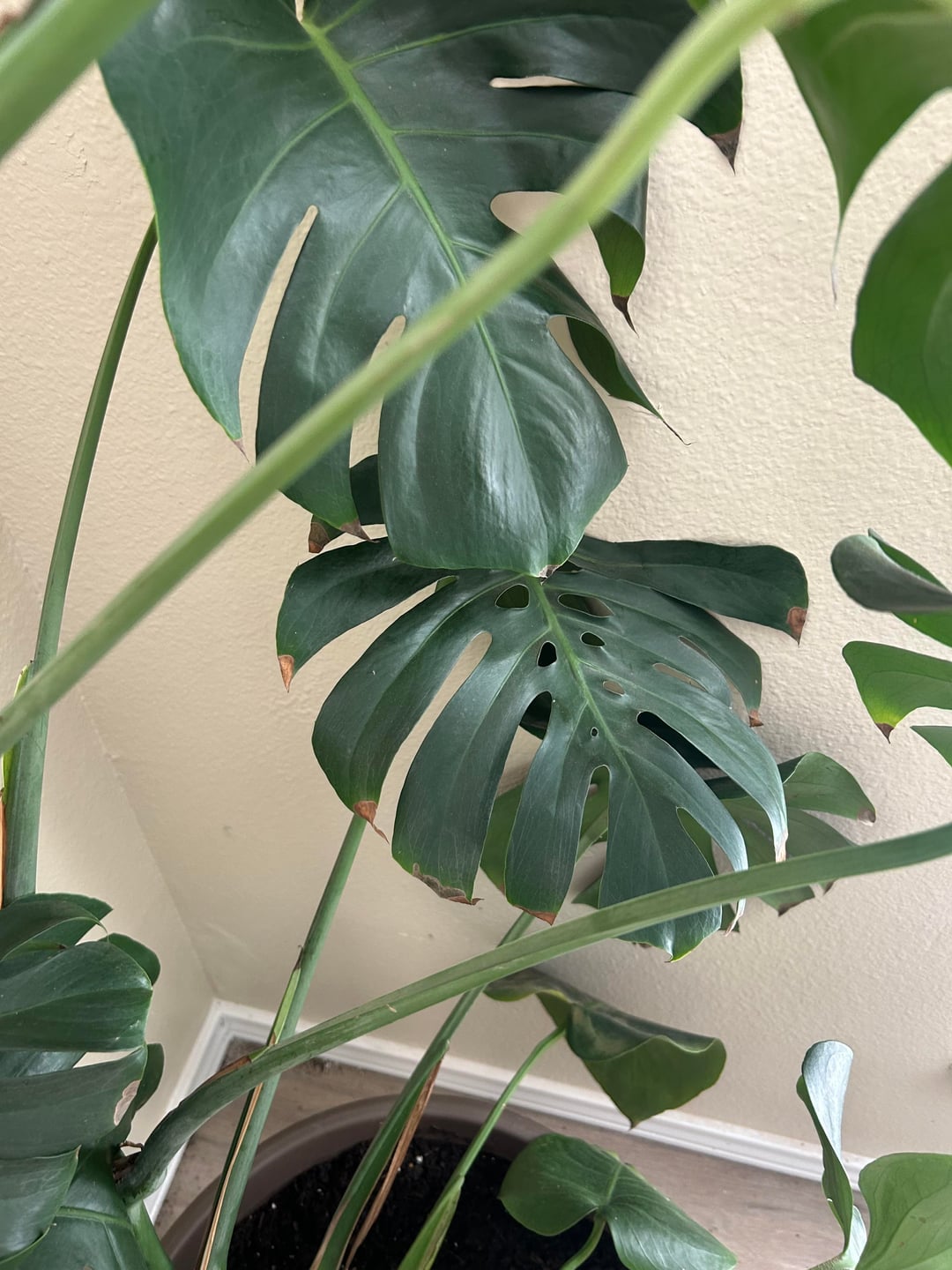 最近、私の怪物は新しい葉を栽培していないように感じます。特に心配しています。なぜなら、その端にある程度のサクサクしていることに気づいているからです。 土壌が乾燥するたびに水をまき、今は土壌が鍋の中でかなり湿っています。 問題をさらに診断/問題を解決するにはどうすればよいですか? 私が心配しているので、これを複数に投稿しています 関係する植物の所有者