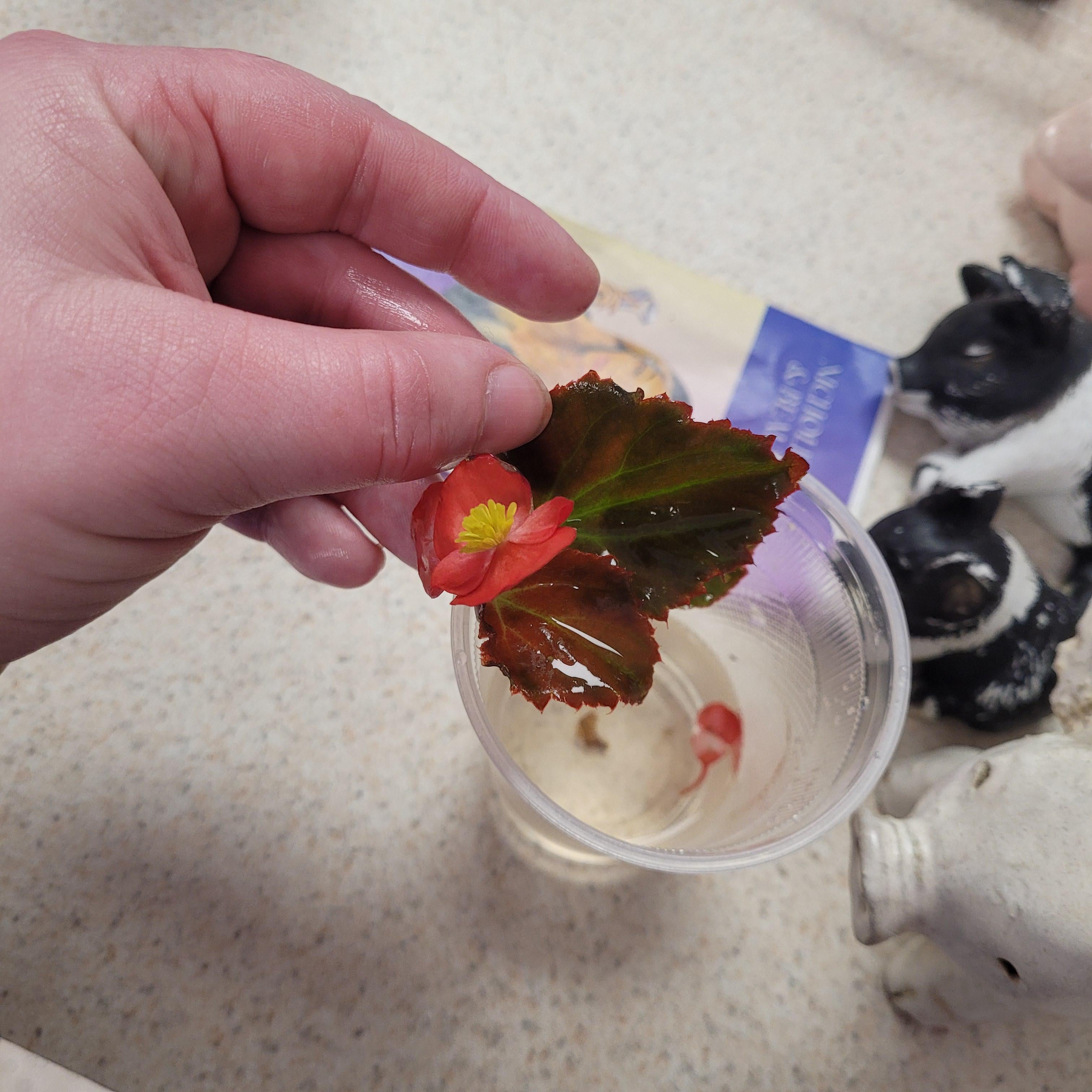 私たちがホテルに立ち上がったとき、私は彼らがあらゆる種類の非常に興味深い植物を持っていることに気づきました。私が今まで見たことのない多肉植物、そしてたくさんのベゴニア。赤、白、ピンクのベゴニア。翌朝出発したとき、私は一枚をつまんで、一杯の水に刺しました。金曜日からその水に入っています。私は私の母に小道具を渡しました(彼女は私の夫と私が私の年上の息子を見るために来ました)、そして私の夫と私は赤ちゃんと一緒に病院にとどまりました。私たちは3日間そこにいましたが、家に帰ってから数日間物事は多忙でした。私たちの睡眠スケジュールは完全に奇抜です。手術は午後だったので、赤ちゃんは翌日全体で薬を飲まれ、疲れ果てていました。それは彼が次の夜全体になりたいと思った。私たちはそれを逆転させる過程にありますが、それは難しいです。私は過去72時間で平均5時間の睡眠をとりました。ただし、私たちはそれを乗り越えます。私の母はずっと彼女と一緒にベゴニアを持っていました。さて、私はついに今日それを取り戻しました。彼女は職場でそれを私に持ってきました。幸いなことに、それはまだうまくやっています。私はそれが腐敗するのではないかと心配しました。私は家に帰ったらすぐにそれを蛍光層に貼り付けることを計画しています。私はFSを介してRooting Begoniasで最も幸運を持っていました。