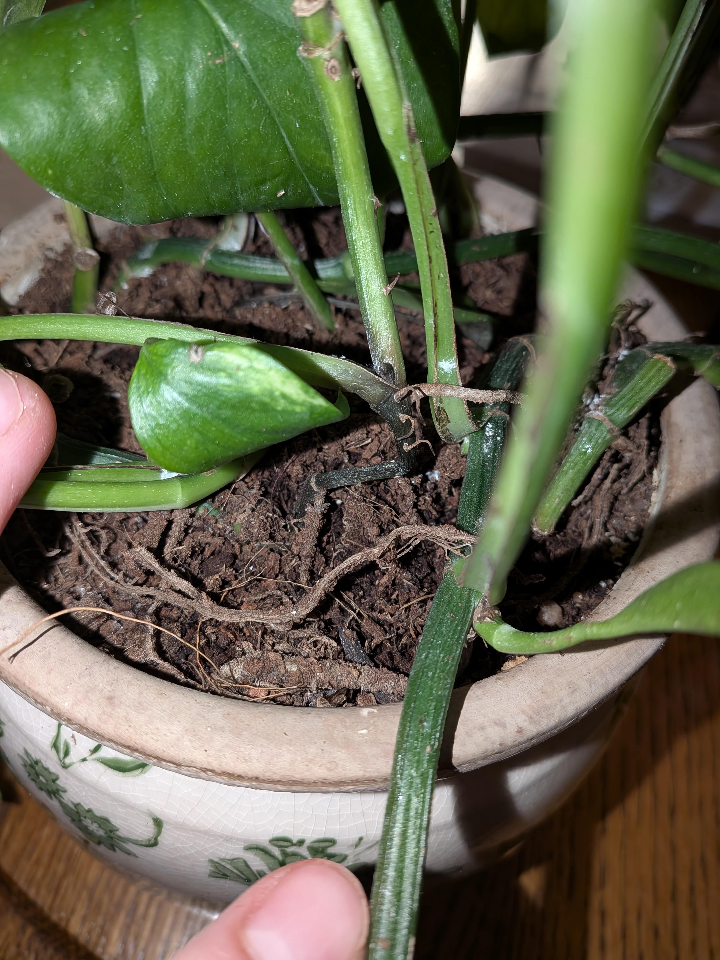 私は今年初めに植物を手に入れたときに、水を摂取し、根の腐敗の教訓を学んだので、私は尋ねました。さらに、私はこの植物でミーリバグ(それらが何であるかを学んだばかりです)を見つけました。それで、ミーリバグはこの茶色のしおれた茎を引き起こす可能性がありますか?または、ミーリバグはそれを引き起こす根腐れを引き起こす可能性がありますか?
