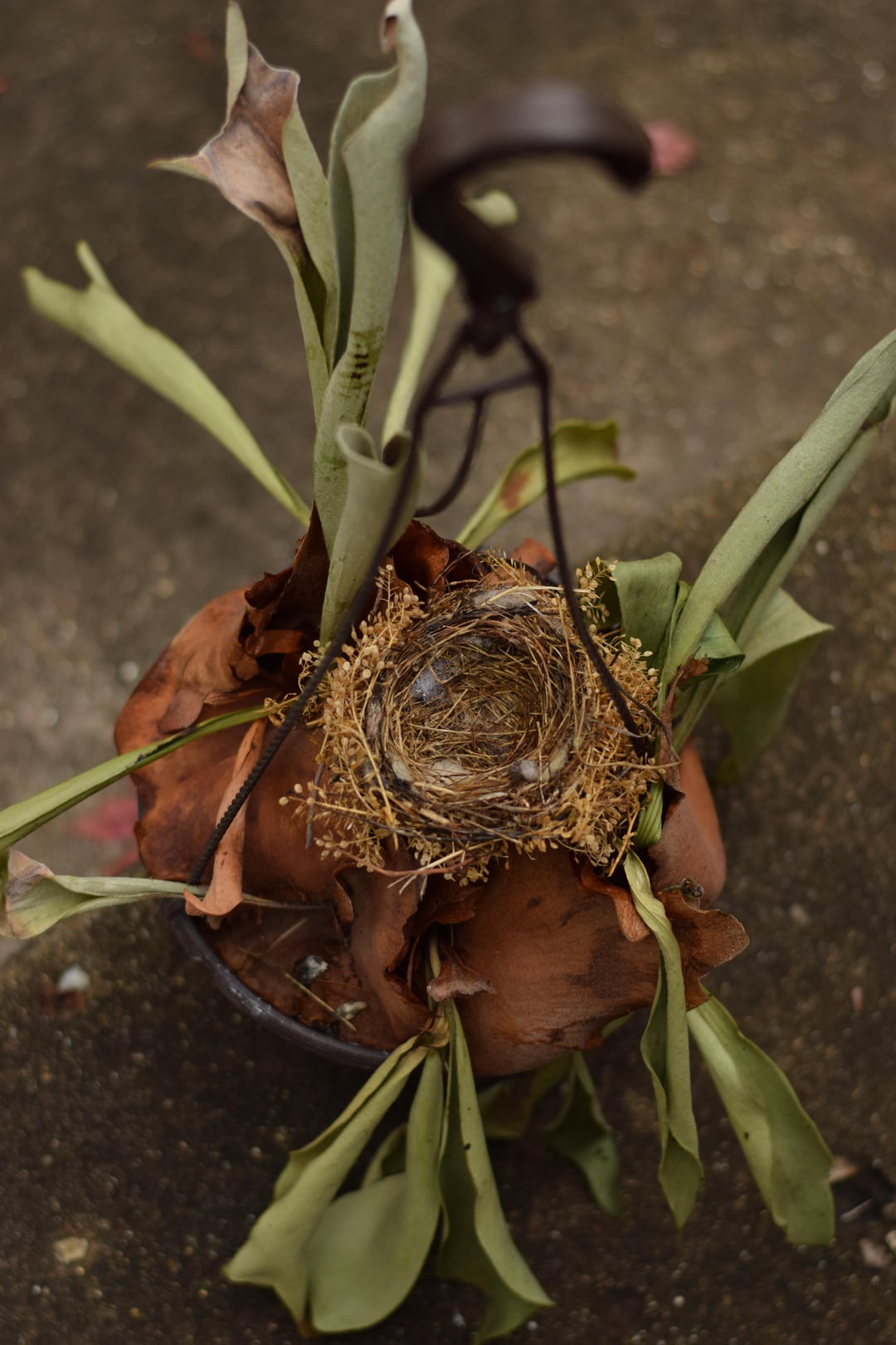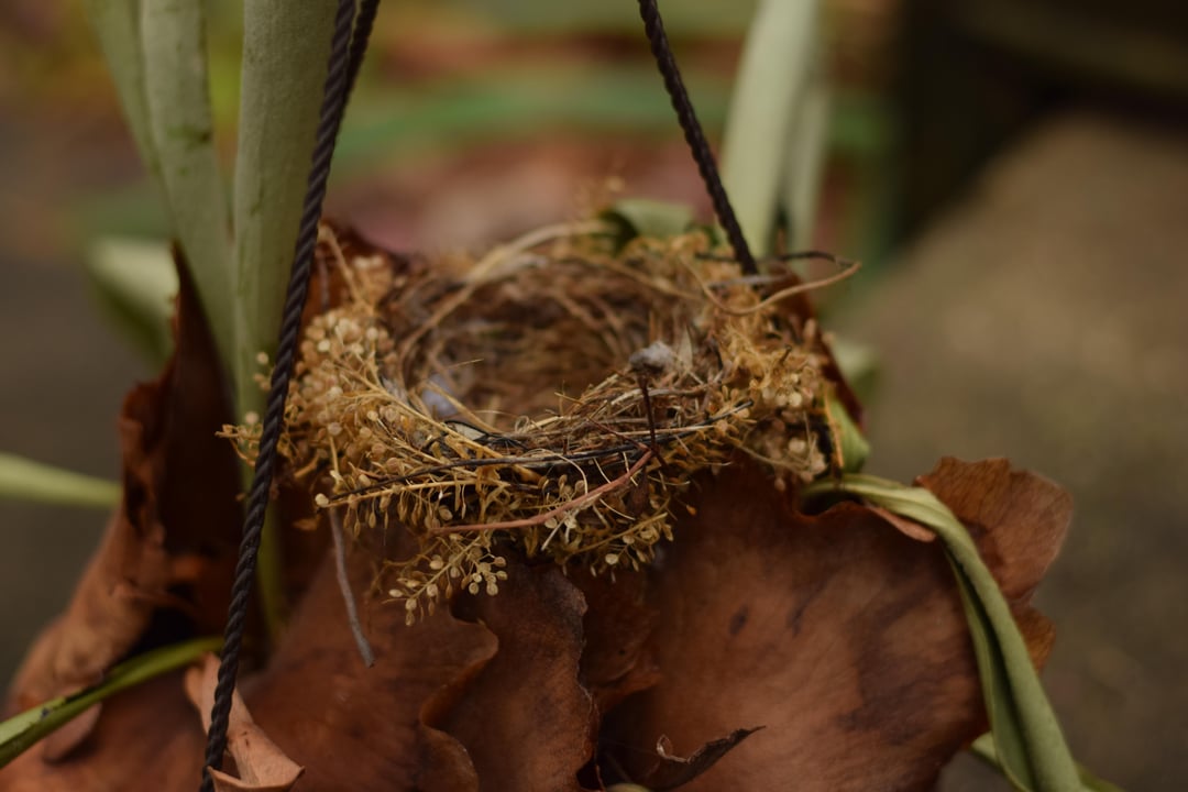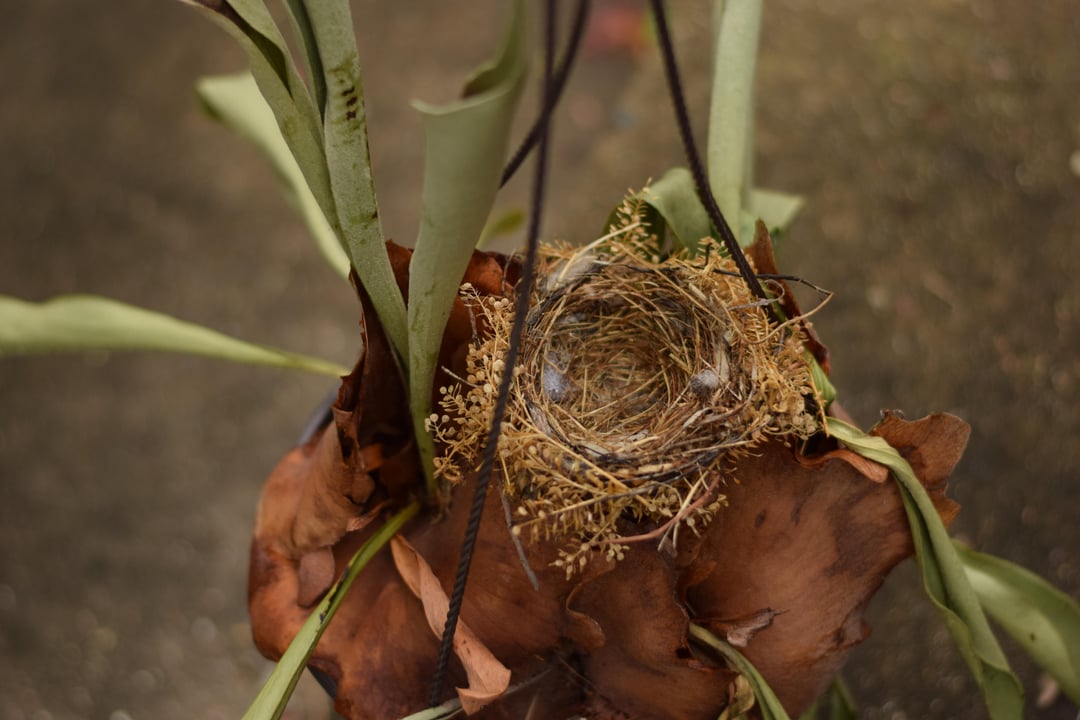 この巣はとてもかわいいと思います。鳥には犬の毛皮とパイナップルが含まれていたようです。