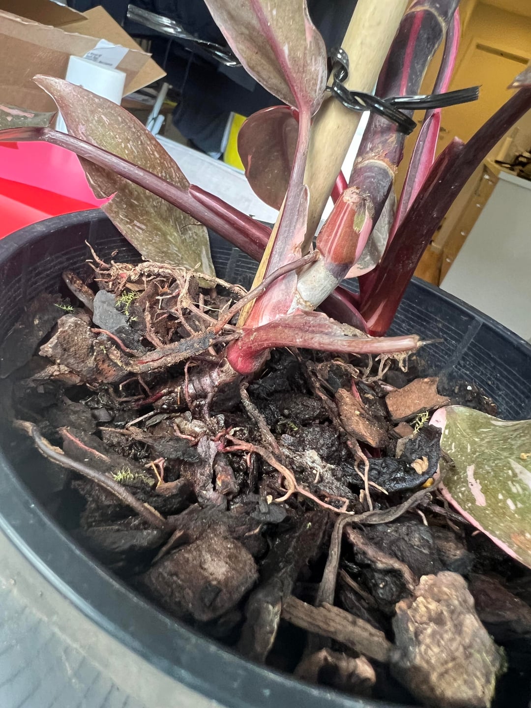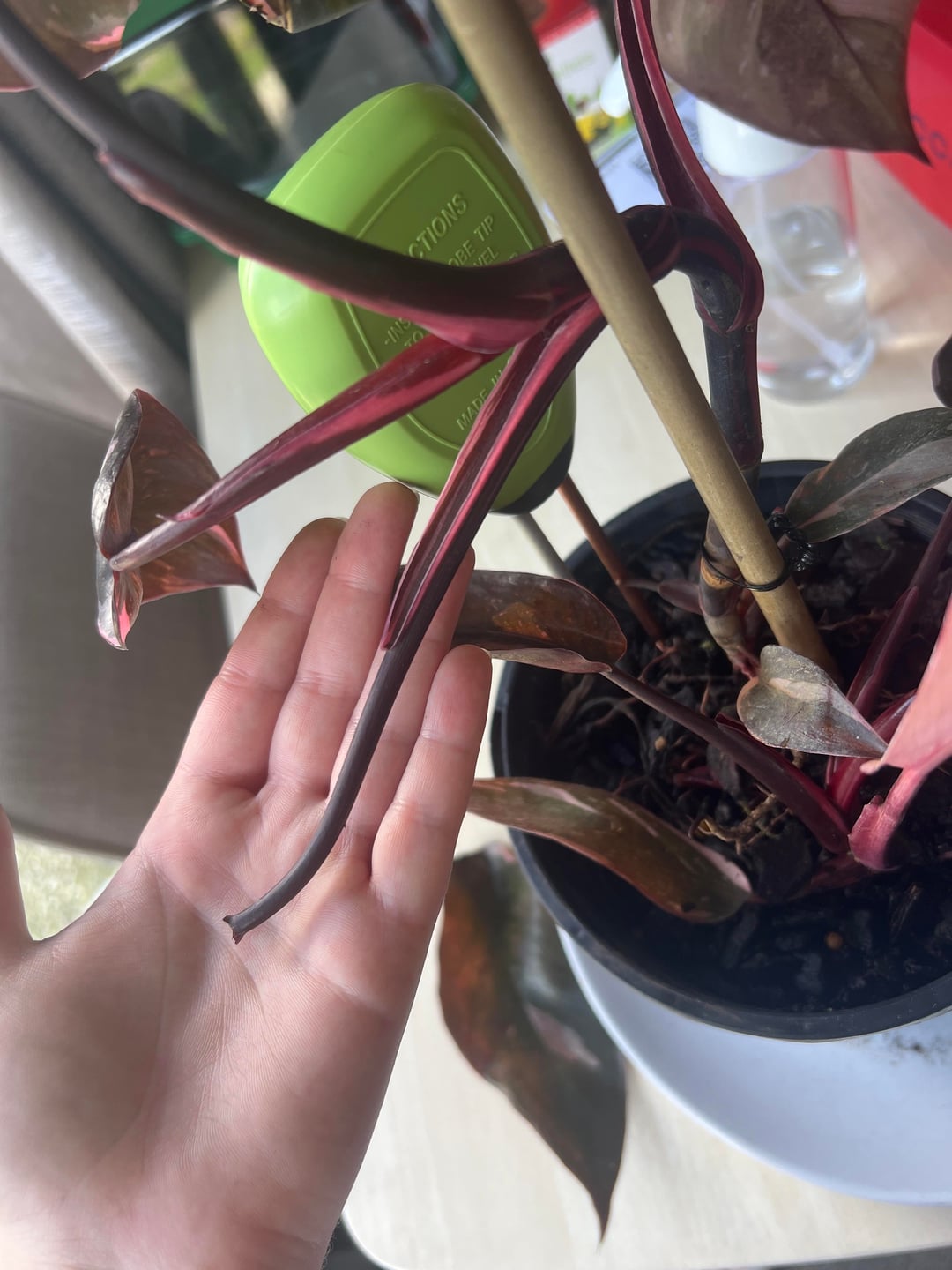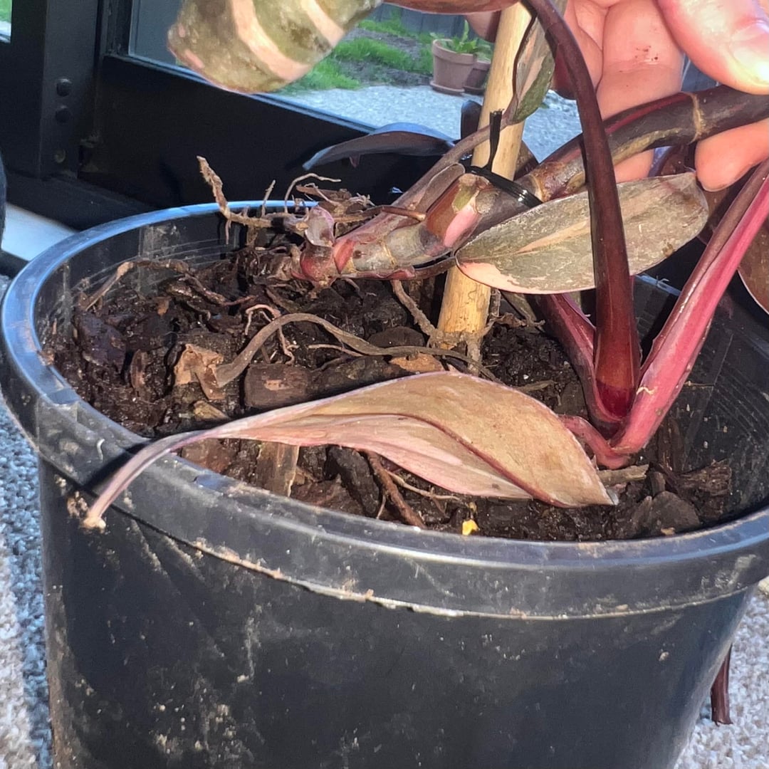 いくつかの葉が落ち、いくつかの葉が損傷していますが、最大の問題は、1つのポットに2つの植物があるように見えることです(問題ではありません)が、そのうちの1つは完全に倒れた/根こそぎになったようです(問題)!いくつかの写真を含めました。