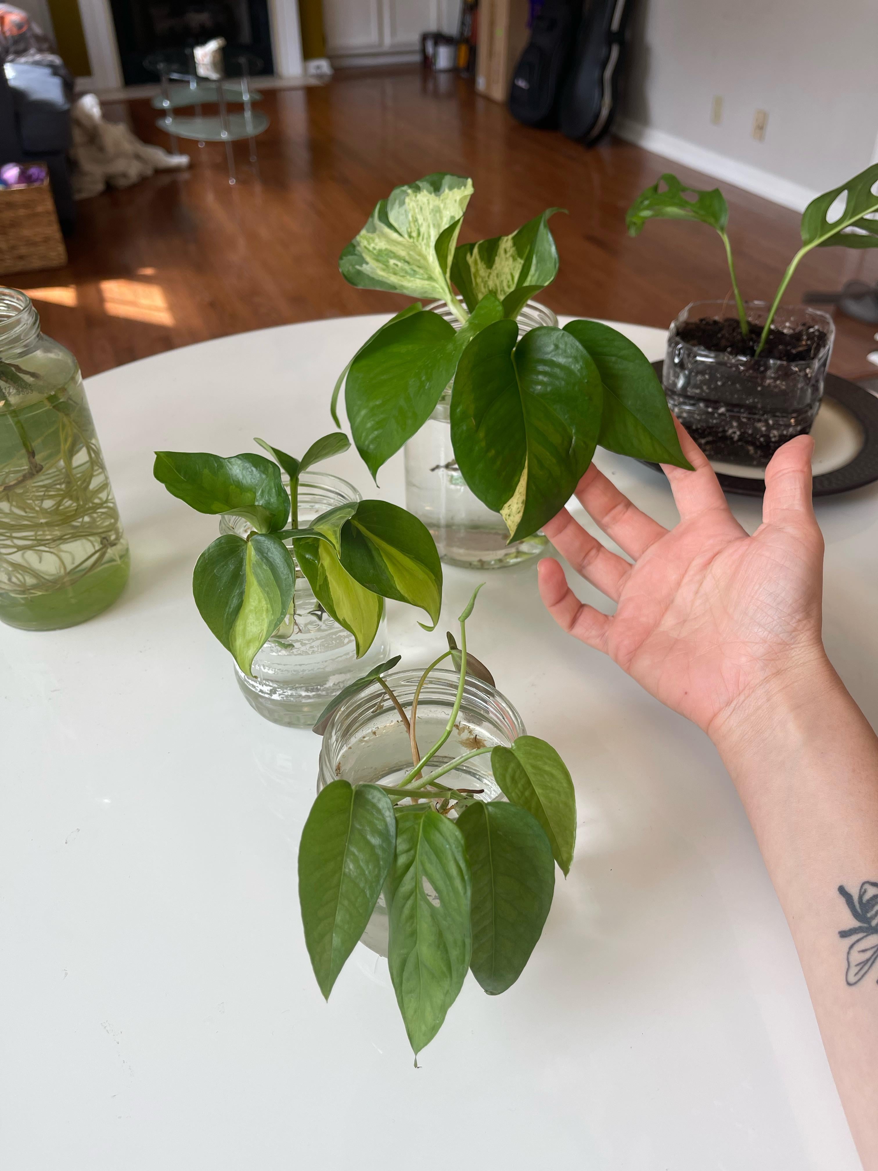 趣味で etsy で挿し木が入ったミステリーボックスを入手しました。 フロント:セブブルー?フィネストレーションが私を混乱させる 中央: ブラジル フィロ、グローバル グリーン バック: マンジュラ、????、ジェイド パトス?わかりません、下の斑入りの葉はマンジュラですか?明るい部分にだけ斑点がありますが、葉はとても平らです どう思いますか?