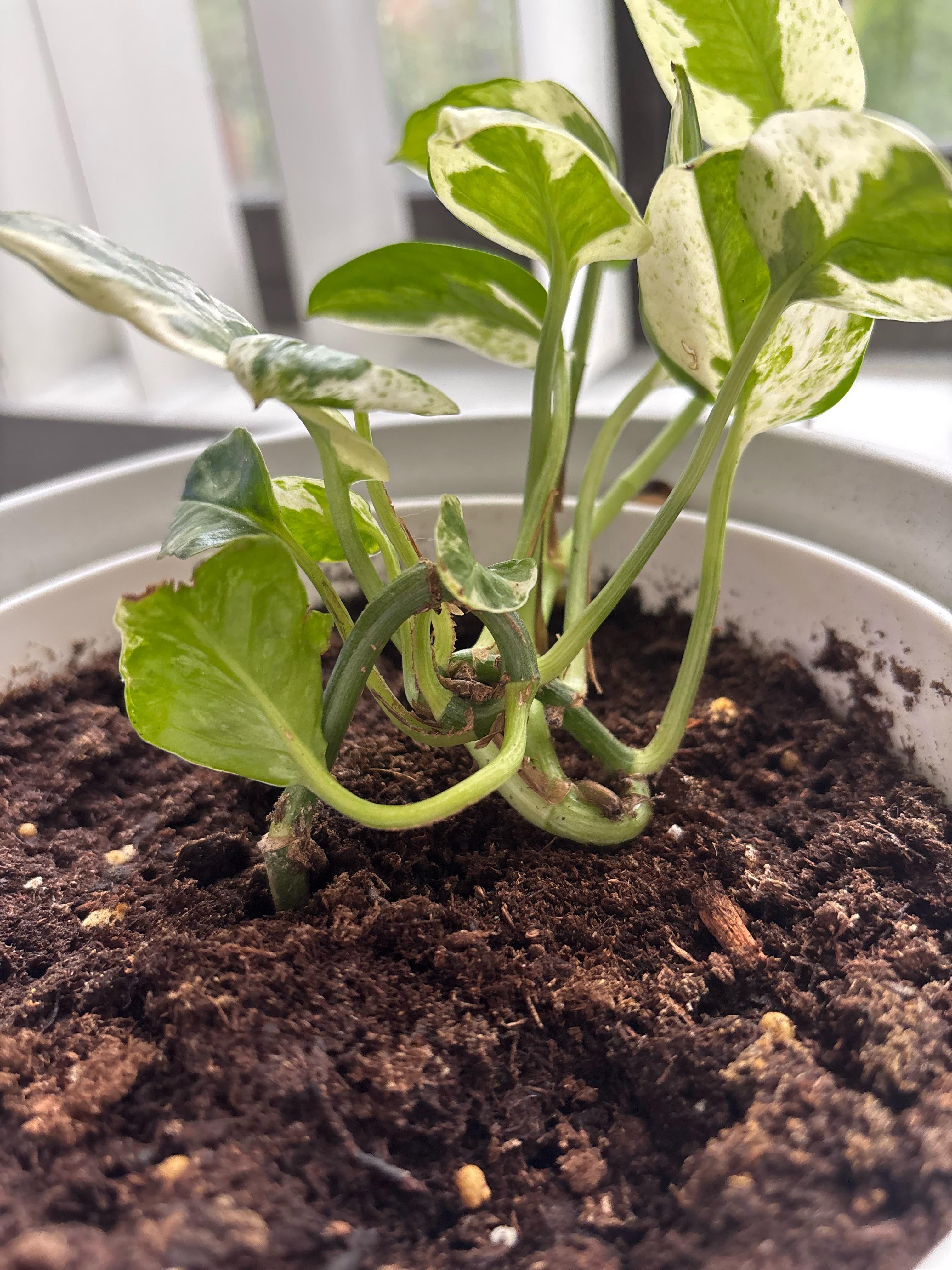 これを茎の挿し木から3か月間水中で増殖させてから、土に移しました。移植してから茎は丸まって、葉は上ではなく茎に向かって成長しています。 この植物は東向きの窓にあり、12時間タイマーで成長ライトが付いています。 この茎のある葉をまっすぐにするにはどうすればよいですか?土に押し込んでプランが茂るのを待ったほうがいいでしょうか。