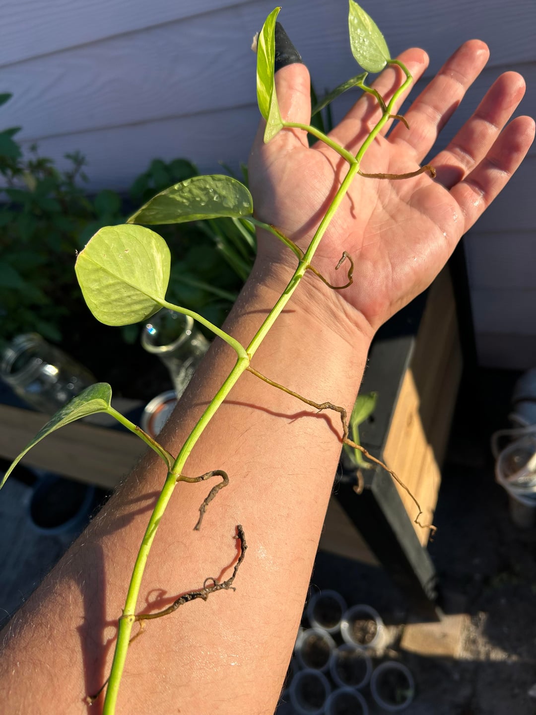 岩が固い土壌(もうすぐツイードキラーを散布する予定)の作業現場で彼女を見つけ、それを拾い上げ、一部を水に、一部を溶岩石とパーライトの入った新鮮な熱帯土壌に置きました。ゴールデンポトスでしょうか?繁栄するには一杯のグラスが良いと思いますか?室内の直射日光の当たる場所に置く予定です。残りの挿し木は屋外のベランダに置いています。助けていただければ幸いです