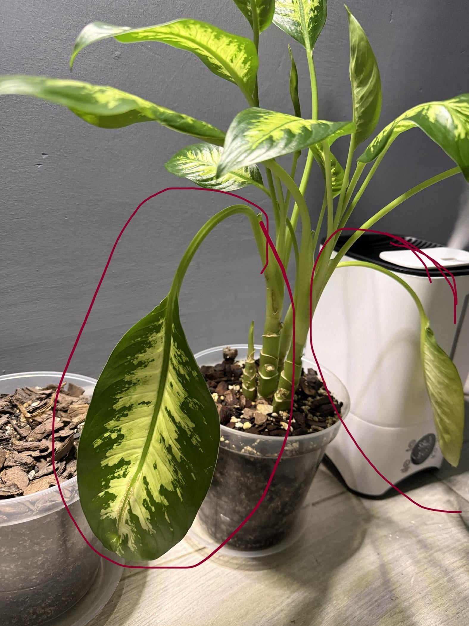 私のディフェンバキアには、地面に向かって傾いた2枚の葉があります。彼らを他の人たちと同じように立たせるにはどうすればよいでしょうか?