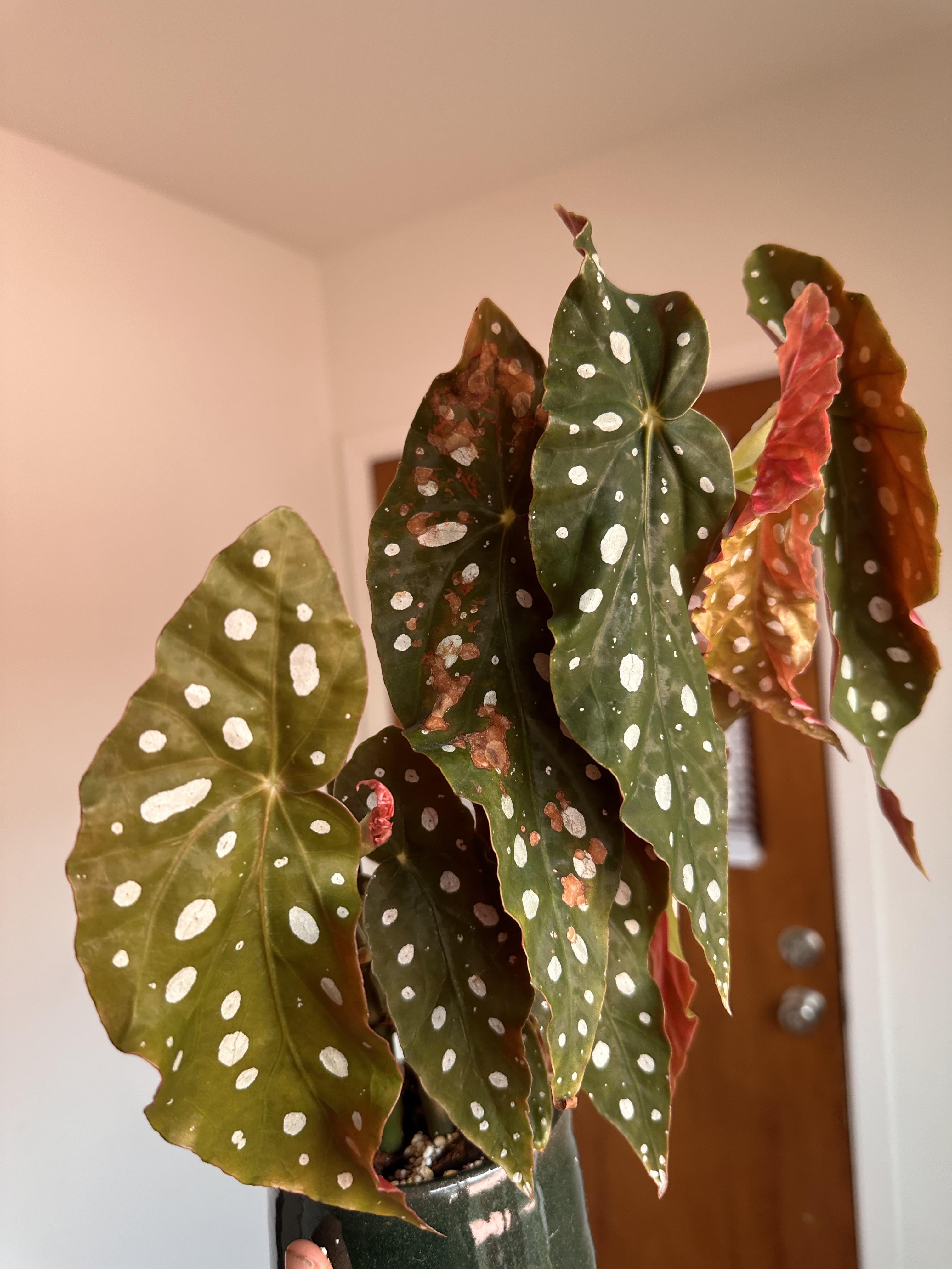 何が起こっているか知っている人はいますか?同じウィンドウに複数のベゴニアがありますが、この葉以外はどれも幸せそうに見えます。新しい成長は健康そうに見えます。水やりの合間に少し乾燥させすぎたのかもしれません。