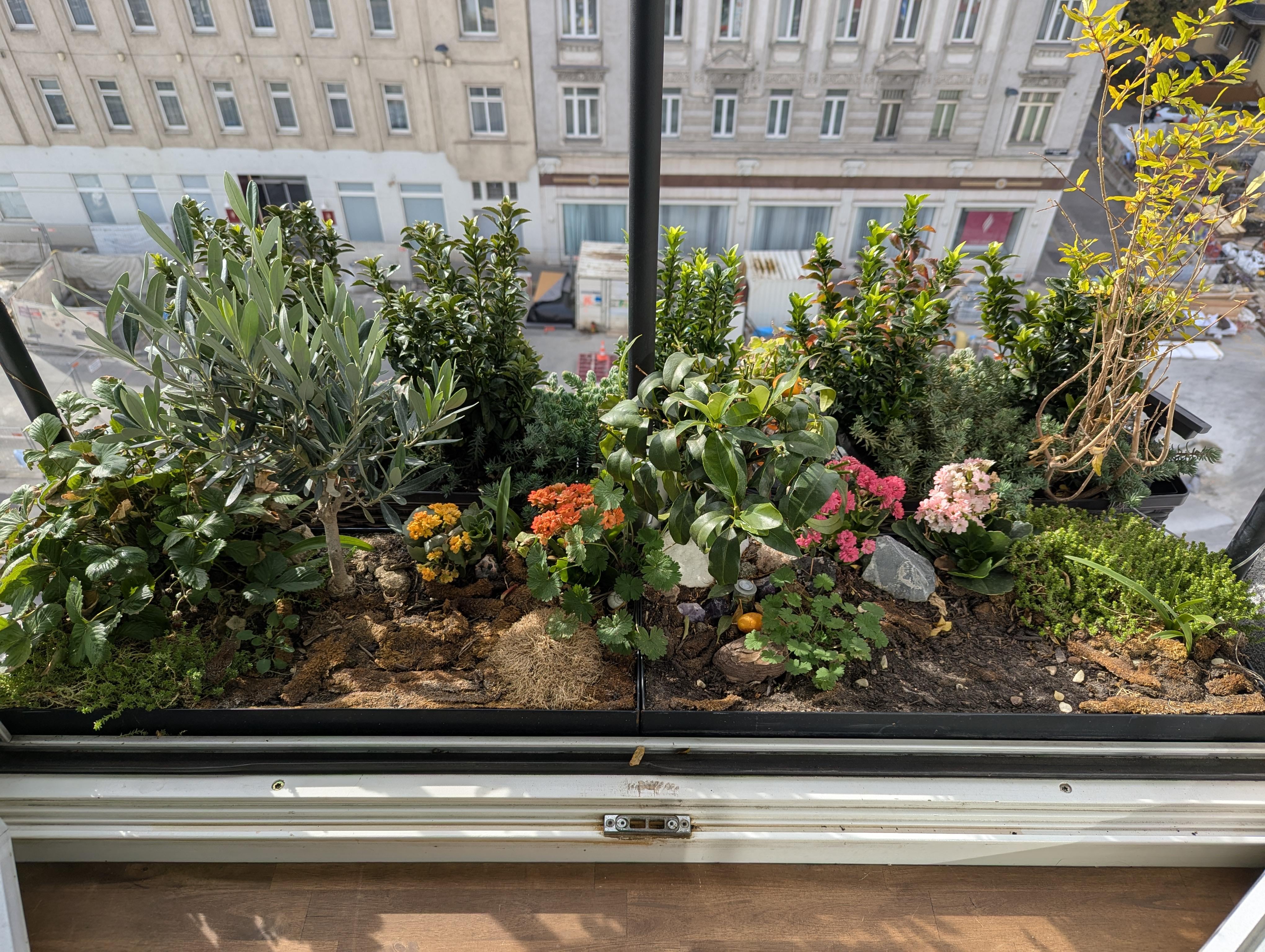 窓に大きな箱を設置しました。それは基本的に私たちの小さなものです "禅の庭" ランダムな小さな植物、花、茂み、多肉植物が含まれています。それらはすべて夏を生き延びました(夏前に植えられました)、唯一生き残れなかったのは私たちが植えた苔だけです "試してみた" 土に植える – 太陽の影響を受けず、植物が十分な日陰を提供してくれることを望みましたが、残念ながらすべて乾いてしまい、今では "禅の庭" 茶色の苔が入っていてまだ完成していないようです。